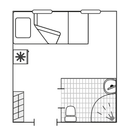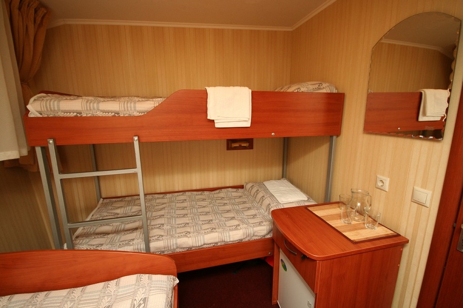 Нижняя палуба | Стандарт В (трехместная, двухъярусная) К категории Стандарт В (трехместная, двухъярусная) относятся каюты: 107, 108, 111–114.Трехместная двухъярусная каюта со всеми удобствами, расположенная на нижней палубе.Площадь каюты от 8,7 до 9,3 м².В каюте: односпальная кровать, одна двухъярусная кровать, ванная комната (раковина, душ, туалет), холодильник, шкаф для одежды, графин, система кондиционирования, радио, розетка, иллюминаторы. | 3-местное размещение | ✔ |