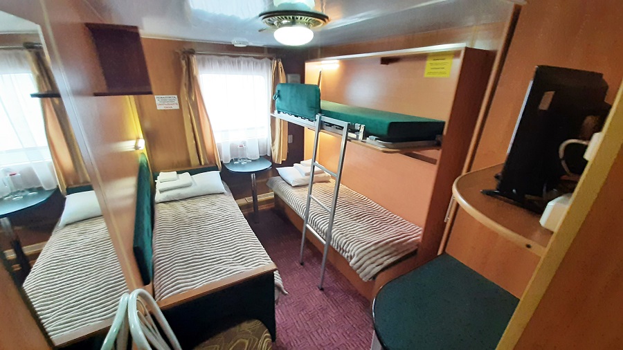 Средняя палуба | Гамма 3-местная К категории Гамма 3-местная относятся каюты: 102, 110–117, 207, 210.Двухместная каюта со всеми удобствами, расположенная на главной, средней палубах.Площадь каюты от 9,5 до 10 м². В каютах 207, 210 – раскладной двуспальный диван и односпальный диван. В каютах 102, 110-117 – дополнительное спальное место верхнего расположения. Доступно только трехместное размещение. В каюте: два односпальных места, ванная комната (раковина, душ, туалет), шкаф для одежды, стол, кондиционирование, мини-холодильник, телевизор, радио, розетка 220 V, обзорное окно. | 3-местное размещение | нет |