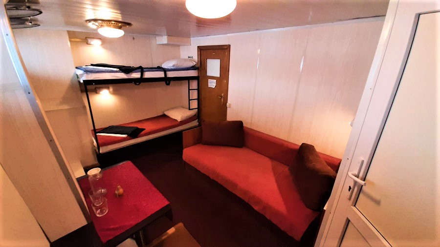 Главная палуба | 1Б К категории 1Б относятся каюты: 40, 42, 44, 46, 48, 50, 52, 54, К-4.Двухместная двухъярусная каюта с частичными удобствами, расположенная на главной и средней палубах.Площадь каюты ≈ 5,5 м². В каюте К-4 два спальных места нижнего расположения. В каюте: двухъярусная кровать, раковина с холодной и горячей водой, шкаф для одежды, радио, розетка 220V, обзорное окно. | 2-местное размещение | нет |