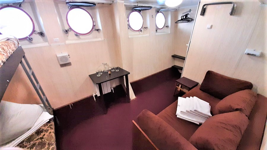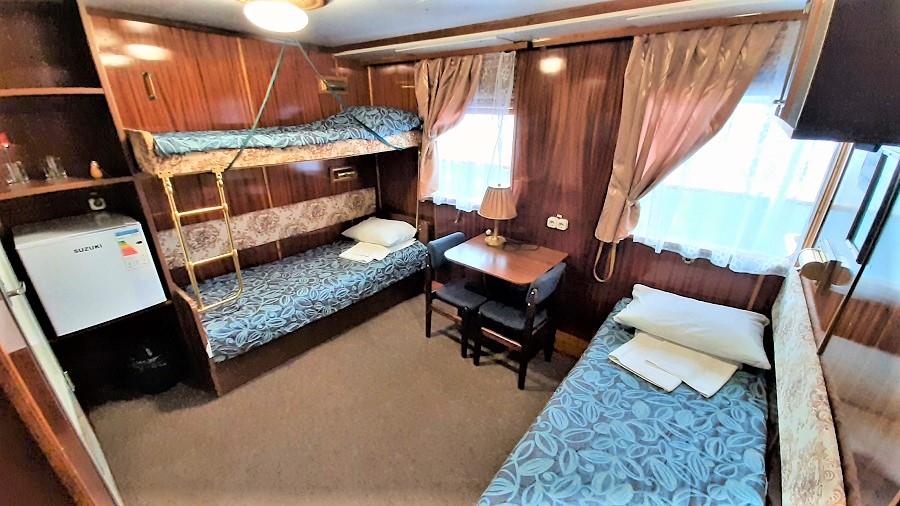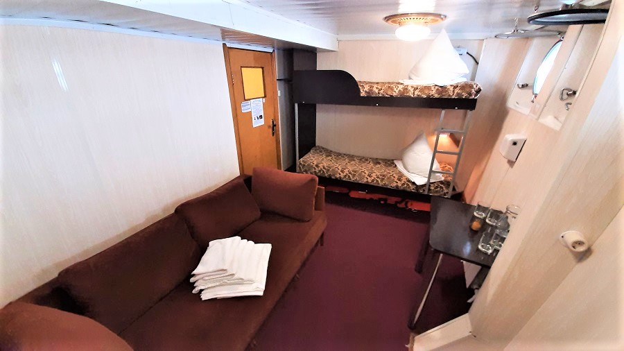 Нижняя палуба | Бета (4) К категории Бета (4) относятся каюты: 122, 123, 126, 127.Четырехместная двухъярусная каюта со всеми удобствами, расположенная на нижней палубе.Площадь каюты ≈ 10 м². Возможно двухместное и трехместное размещение в каюте. В каюте: двухъярусная кровать, двуспальный диван, ванная комната (раковина, душ, туалет), уголок для одежды, радио, розетка 220V, иллюминаторы. | 4-местное размещение | ✔ |