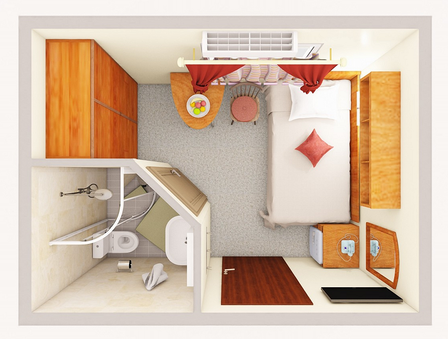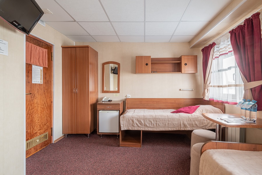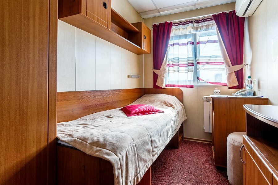 Средняя палуба | А1(I) К категории А1(I) относятся каюты: 201, 202, 205, 206, 313. Одноместная каюта со всеми удобствами, расположенная на средней и главной палубах. Площадь каюты от 7,8 до 9 м².В каюте: односпальная кровать, ванная комната (раковина, душевая кабина, туалет), шкаф, тумба, пуф, стол, настенная полка, телевизор с кабельным и спутниковым вещанием, холодильник, кондиционер, телефон внутренней связи, фен, плед, розетки 220 V, щетка для одежды, обзорное окно. | 1-местное размещение | нет |