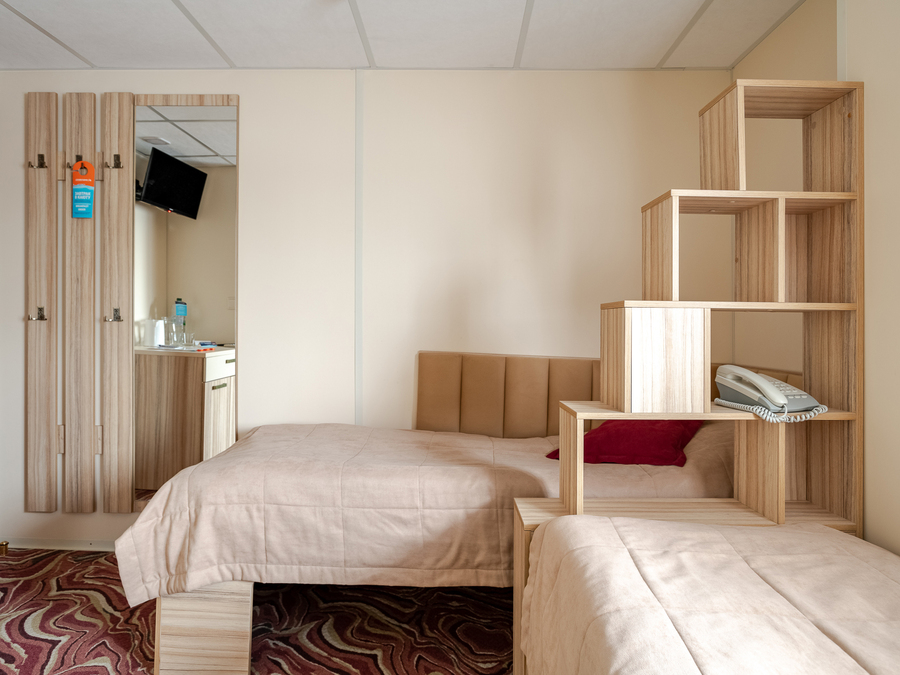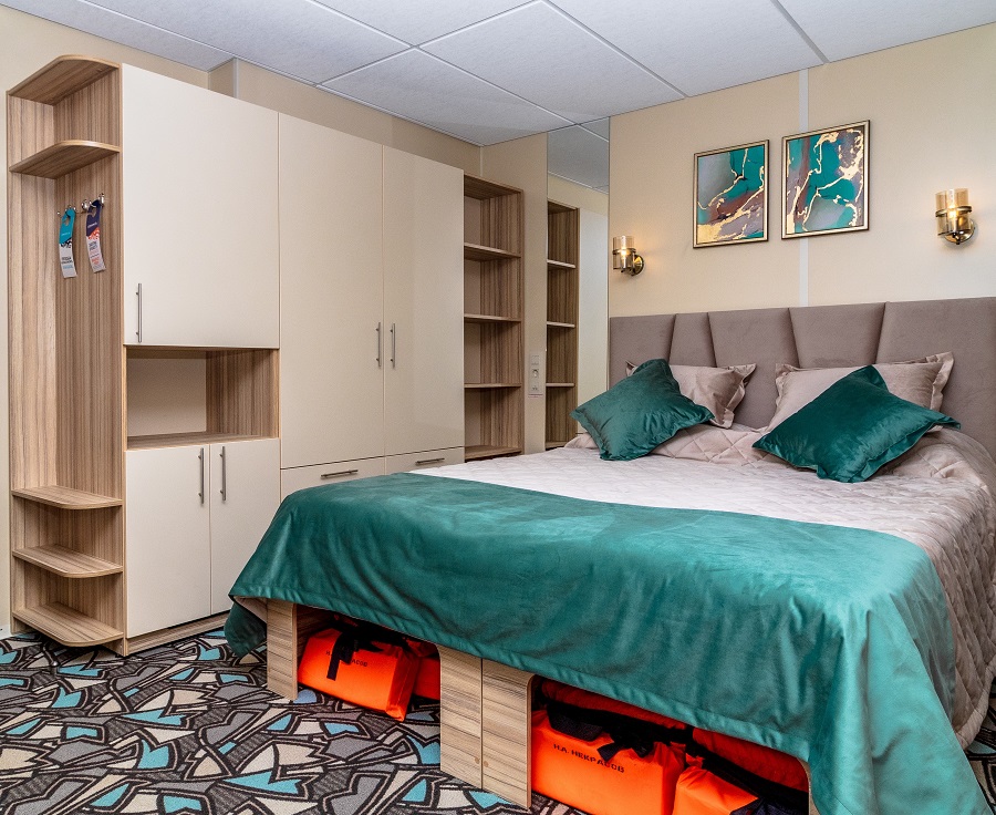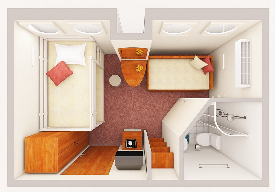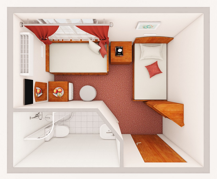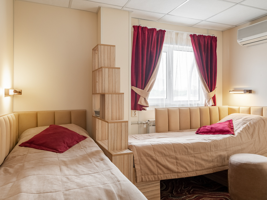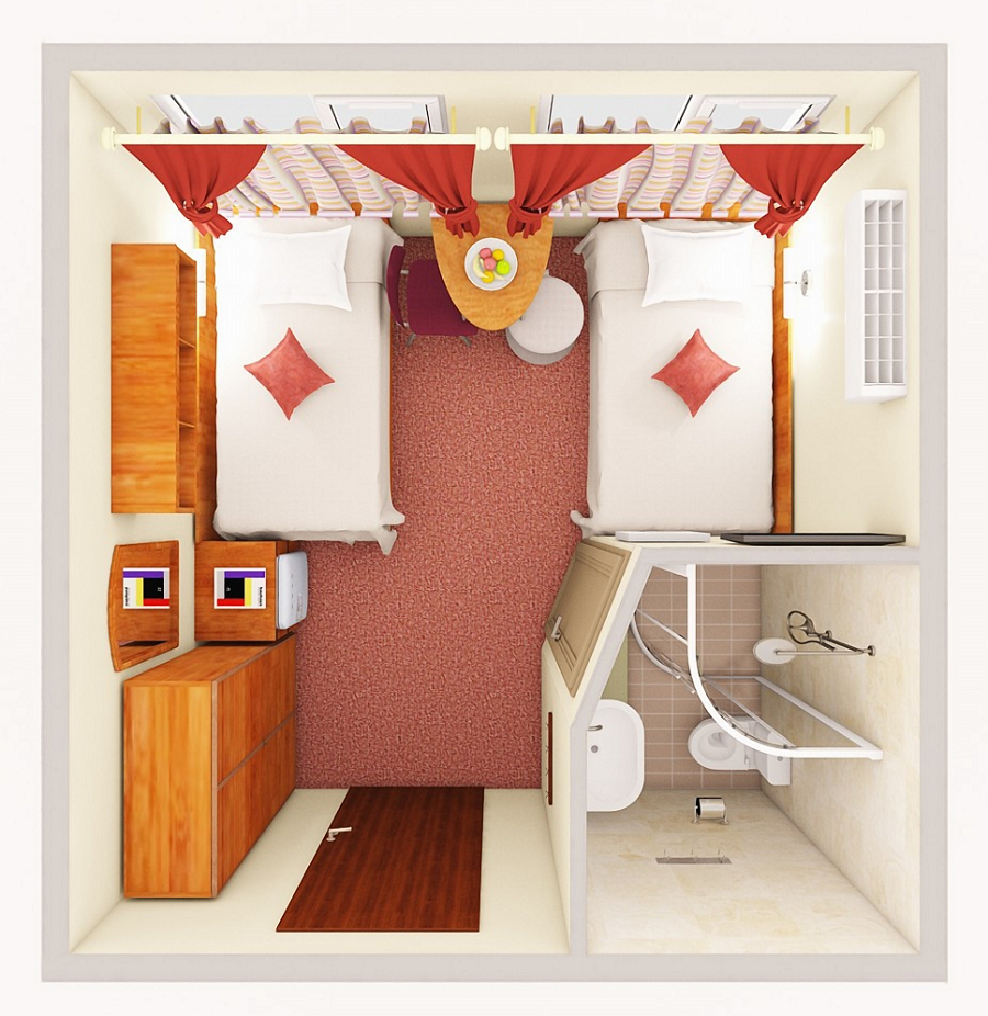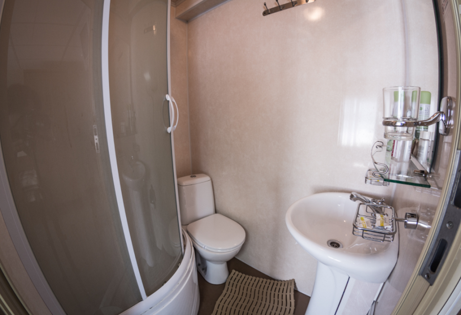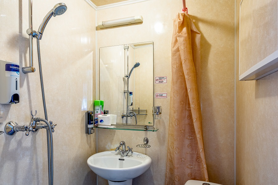Средняя палуба | А2 К категории А2 относятся каюты: 309, 311. Двухместная каюта увеличенной площади со всеми удобствами, расположенная на средней палубе. Площадь каюты ~ 12 м². В каюте 311 можно установить дополнительное спальное место – раскладная кровать. Размещение ребенка до 5 лет без места и питания, при наличии свободного дополнительного места, производится только по согласованию с судоходной компанией. В каюте возможен шум от работы вспомогательных агрегатов и температура воздуха на 2 градуса выше, чем средняя по каютам. В каюте: две односпальные кровати, ванная комната (раковина, душевая кабина, туалет), шкаф, тумба, пуф, стол, настенная полка, телевизор с кабельным и спутниковым вещанием, холодильник, кондиционер, телефон внутренней связи, фен, плед для каждого туриста, розетки 220 V, щетка для одежды, обзорные окна. | 2-местное размещение | ✔ |