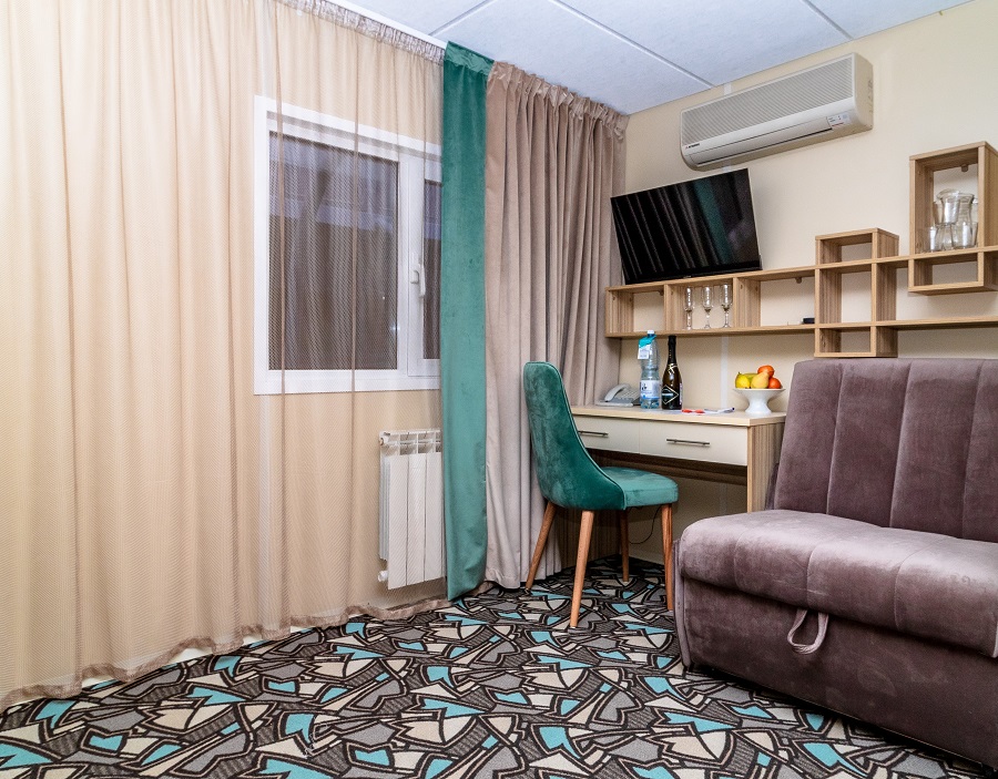 Средняя палуба | Полулюкс К категории Полулюкс относятся каюты: 317, 318. Двухместная каюта увеличенной площади со всеми удобствами, расположенная на средней палубе. Площадь каюты ≈ 15,8 м². Возможно размещение третьего человека на дополнительном месте – кресло-кровать. Размещение ребенка до 5 лет без места и питания, при наличии свободного дополнительного места, производится только по согласованию с судоходной компанией. В каюте: двуспальная кровать (при необходимости трансформируется в две односпальные кровати) и кресло-кровать (1 спальное место), ванная комната (раковина, душевая кабина, туалет), шкаф, прикроватные тумбы, кресло, туалетный стол, книжная полка, вешалка для верхней одежды, телевизор с кабельным и спутниковым вещанием, холодильник, кондиционер, сейф, телефон внутренней связи, розетки 220 V, фен, плед для каждого туриста, обзорные окна.Также к услугам туристов в каютах: косметика для душа, туалетные принадлежности, щетка для одежды, банные халаты, маски для сна, тапочки, набор посуды и столовых приборов, чайная пара, питьевая вода и «приветственный набор» (игристый напиток, фрукты), кофе/чай, мини-бар (за дополнительную плату), капсульная кофемашина (одна чашка кофе на человека – в подарок). | 2-местное размещение | ✔ |
