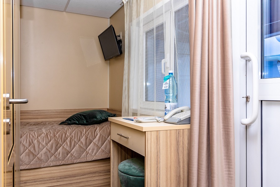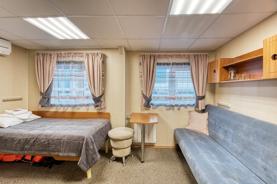 Средняя палуба | А1(I) К категории А1(I) относятся каюты: 201, 202, 207, 208, 313. Одноместные каюты со всеми удобствами, расположенные на средней и главной палубах. Площадь каюты от 7 до 12,3 м².В каюте: односпальная кровать, ванная комната (раковина, душевая кабина, туалет), шкаф, тумба, пуф, стол, настенная полка, телевизор с кабельным и спутниковым вещанием, холодильник, кондиционер, телефон внутренней связи, розетки 220 V, радио, фен, плед, щетка для одежды, обзорное окно. | 1-местное размещение | нет |