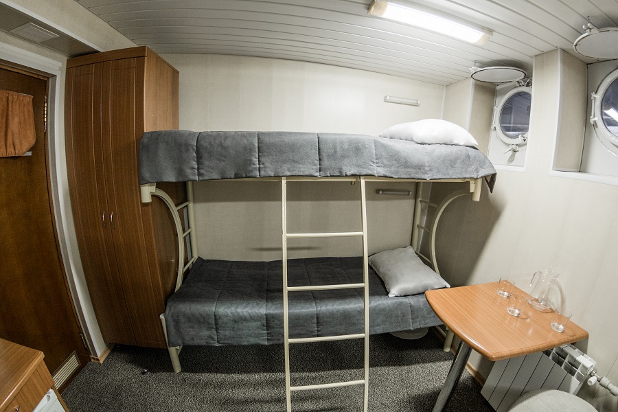 Нижняя палуба | А2н К категории А2н относятся каюты: 107–110. Двухместная двухъярусная каюта со всеми удобствами, расположенная на нижней палубе. Площадь каюты от 11,2 до 12 м². Возможно размещение третьего человека на дополнительном месте – спальное место верхнего расположения. Размещение ребенка до 5 лет без места и питания, при наличии свободного дополнительного места, производится только по согласованию с судоходной компанией. В каюте: две односпальные кровати и одно спальное место верхнего расположения, ванная комната (раковина, душевая кабина, туалет), шкаф, тумба, пуф, стол, кондиционер, холодильник, розетки 220 V, радио, телевизор с кабельным и спутниковым вещанием, фен, плед для каждого туриста, щетка для одежды, иллюминаторы. | 2-местное размещение | ✔ |