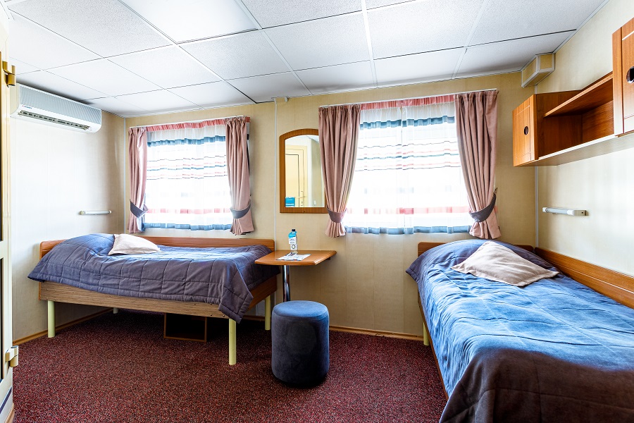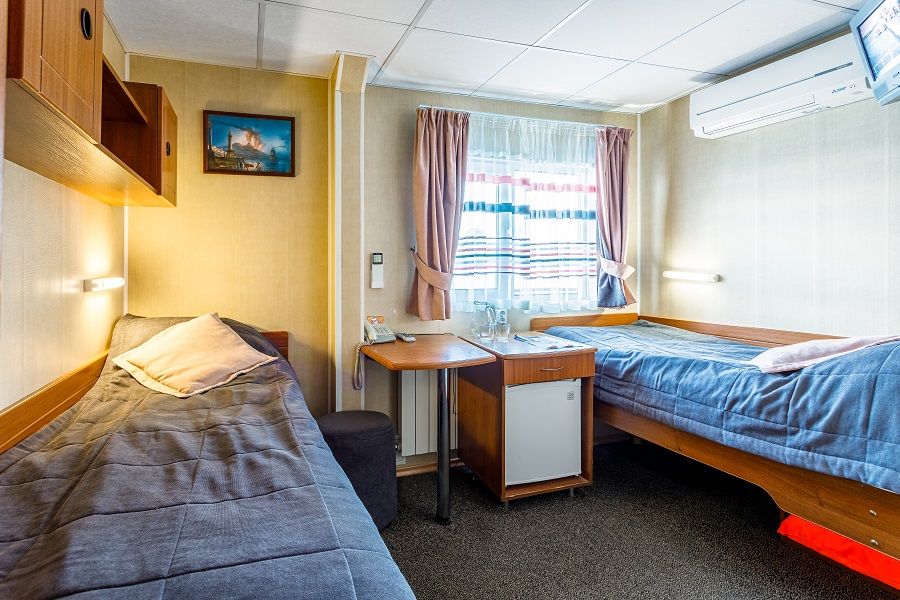 Средняя палуба | А2+(III) К категории А2+(III) относятся каюты: 203–206, 211–214, 303–310. Двухместная каюта увеличенной площади со всеми удобствами, расположенная на главной и средней палубах. Площадь каюты от 8,8 до 12,5 м².В каюте: две односпальные кровати, ванная комната (раковина, душевая кабина, туалет), шкаф, тумба, пуф, стол, настенная полка, кондиционер, телевизор с кабельным и спутниковым вещанием, холодильник, телефон внутренней связи, розетки 220 V, радио, фен, плед для каждого туриста, щетка для одежды, обзорные окна. | 2-местное размещение | ✔ |