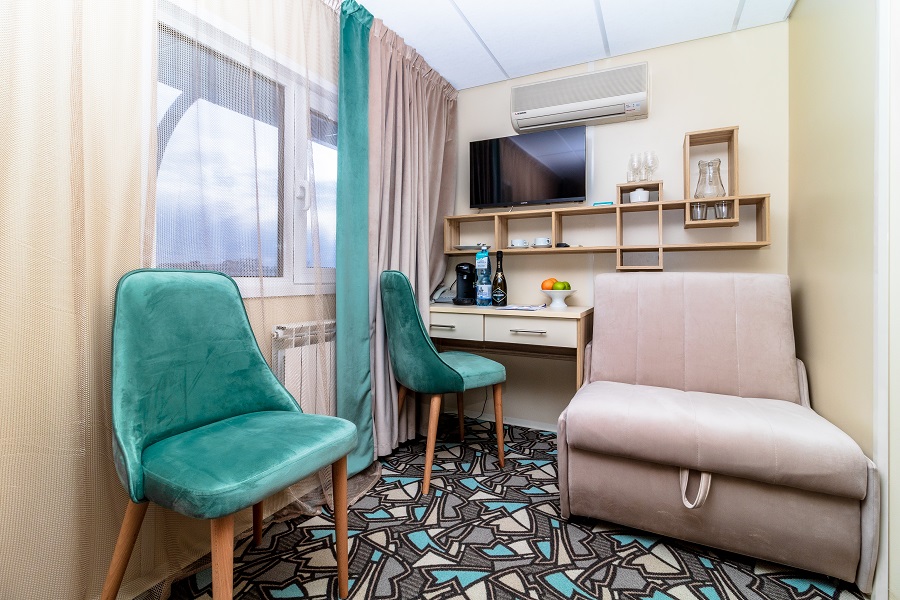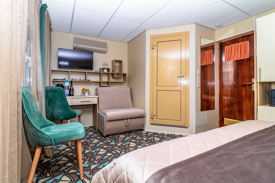 Средняя палуба | Полулюкс К категории Полулюкс относятся каюты: 317, 318. Двухместная каюта увеличенной площади со всеми удобствами, расположенная на средней палубе. Площадь каюты ≈ 15,6 м². Возможно размещение третьего человека на дополнительном месте – кресло-кровать. Размещение ребенка до 5 лет без места и питания, при наличии свободного дополнительного места, производится только по согласованию с судоходной компанией. В каюте: двуспальная кровать (при необходимости трансформируется в две односпальные кровати) и кресло-кровать (1 спальное место), ванная комната (раковина, душевая кабина, туалет), шкаф, прикроватные тумбы, два кресла, туалетный стол, книжная полка, вешалка для верхней одежды, кондиционер, телевизор с кабельным и спутниковым вещанием, холодильник, сейф, телефон внутренней связи, розетки 220 V, фен, плед для каждого туриста, обзорные окнаТакже к услугам туристов в каюте: косметика для душа, туалетные принадлежности, «приветственный набор» (игристый напиток, фрукты), мини-бар (за дополнительную плату), щетка для одежды, банные халаты, маски для сна, тапочки, набор посуды и столовых приборов, питьевая вода, чайная пара, «приветственный набор» (игристый напиток, фрукты), капсульная кофемашина (одна чашка кофе на человека – в подарок). | 2-местное размещение | нет |