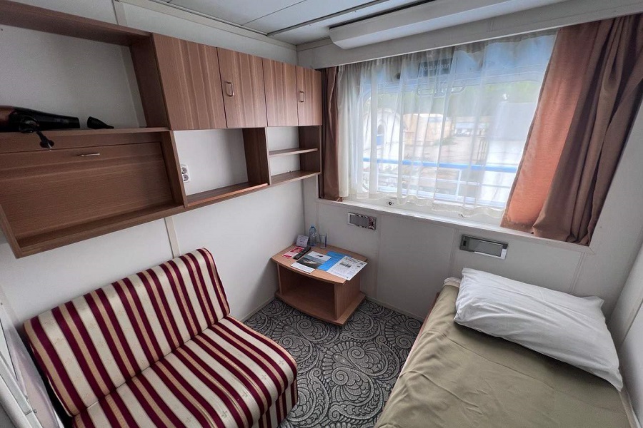 | Шлюпочная палуба | 1-местная (шлюпочная палуба) К категории 1-местная (шлюпочная палуба) относятся каюты: 419–426.Одноместная каюта со всеми удобствами, расположенная на шлюпочной палубе. Площадь каюты ≈ 6 м². Доступ к Wi-Fi предоставляется с ограничением трафика. В каюте: односпальная кровать, кондиционер/обогреватель, телевизор, сейф, внутренний телефон, фен, стеклянные стаканы для питья, щетка для одежды, обзорное окно.В ванной комнате: душ, зеркало, 2 стакана, туалетные принадлежности (мыло, шампунь, гель для душа, туалетная бумага), комплект полотенец (полотенце банное большое, полотенце для рук среднее). | 1-местное размещение | нет |