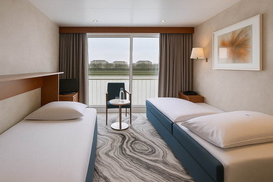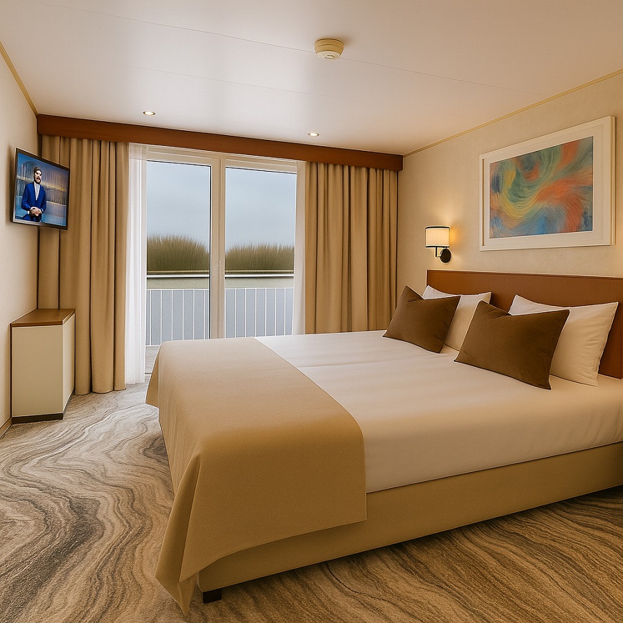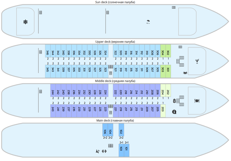 | Upper deck (верхняя палуба) | DOUBLE A К категории DOUBLE A относятся каюты: 305-340.Двухместная каюта, расположенная на верхней палубе.Площадь каюты ≈ 12 м². В каютах 305-334 – одна двуспальная кровать. В каютах 335-340 – две односпальные кровати. В каюте: одна двуспальная или две односпальные кровати, ванная комната (раковина, душ, туалет), комплект полотенец, фен, шкаф для одежды, холодильник, спутниковое телевидение, телефон внутренней связи, радио, сейф, кондиционер, стеклянная балконная дверь, французский балкон. | 2-местное размещение | ✔ |