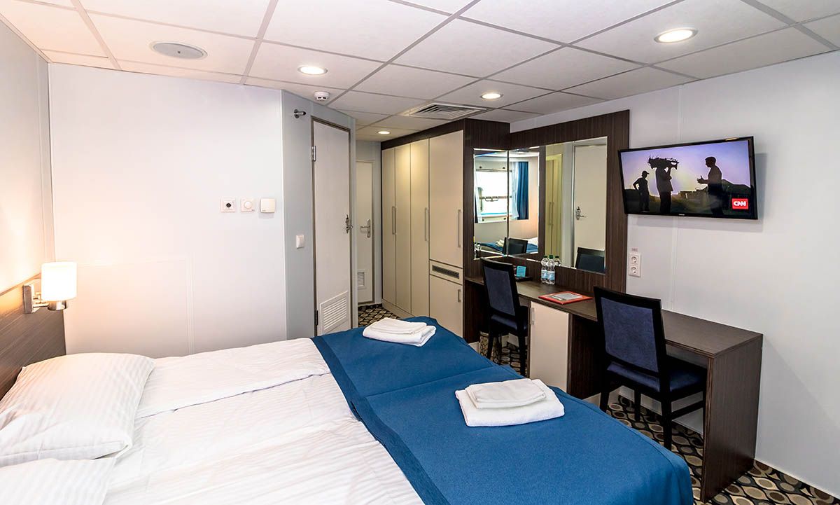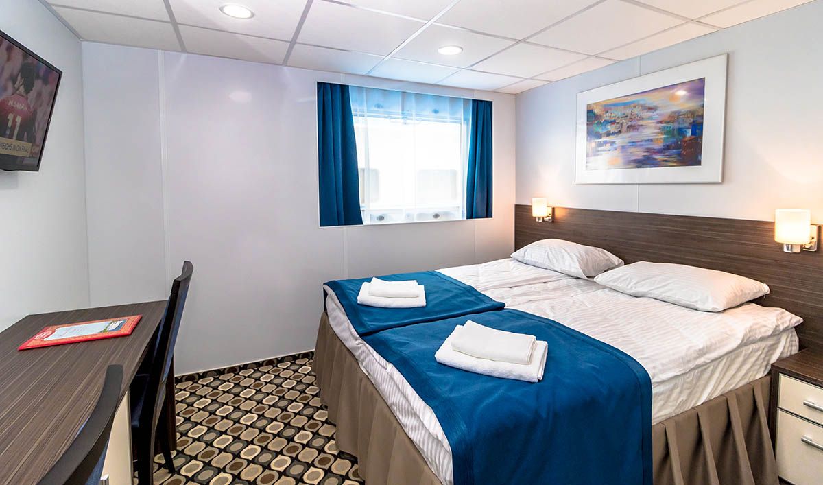 | Шлюпочная палуба | Двухместная Однокомнатная каюта с удобствами, рассчитанная на размещение двух человек Расширена площадь санблока, отдельный душ, санузел, кондиционер. В каюте: два спальных места, шкаф для одежды, трюмо, радио, телевизор, фен, холодильник, сейф, обзорное окно, электророзетка на 220V.Площадь каюты 10,3 м2Размер кроватей 80х190 см | 2-местное размещение | нет |