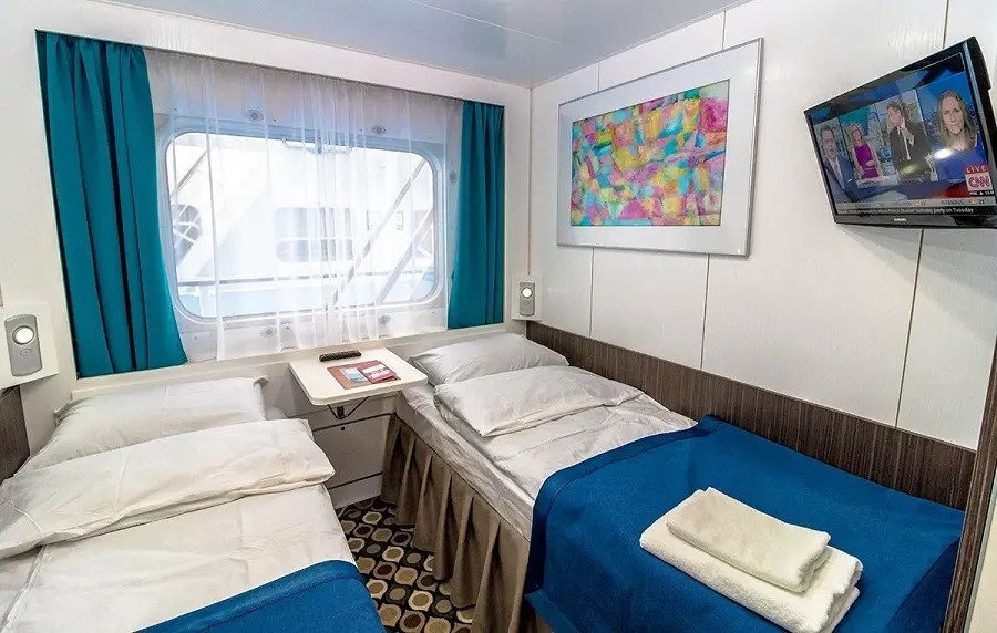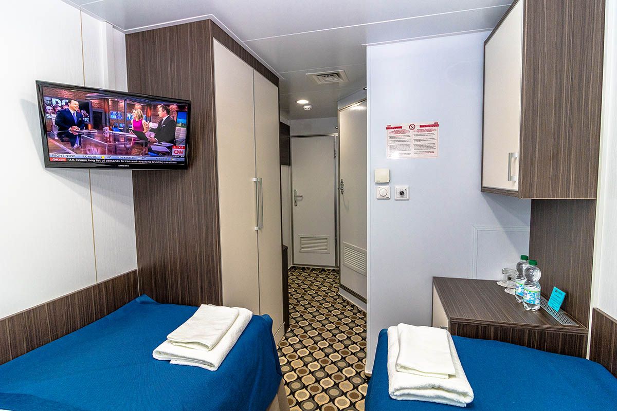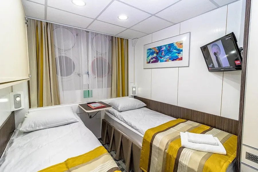 | Средняя палуба | Двухместная Однокомнатная каюта с удобствами, рассчитанная на размещение двух человек Расширена площадь санблока, отдельный душ, санузел, кондиционер. В каюте: два спальных места, шкаф для одежды, трюмо, радио, телевизор, фен, холодильник, сейф, обзорное окно, электророзетка на 220V.Площадь каюты 10,3 м2Размер кроватей 80х190 см | 1-местное размещение | нет |