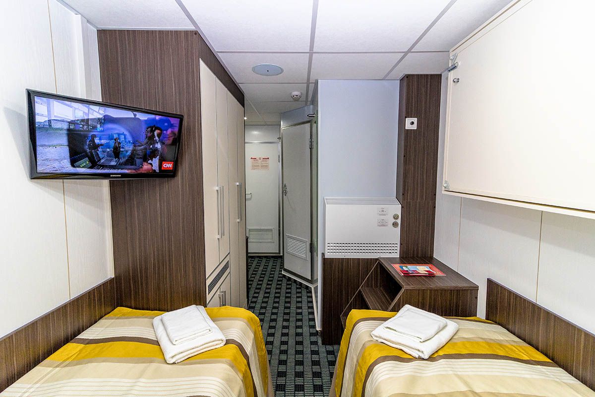| Шлюпочная палуба | Двухместная Однокомнатная каюта с удобствами, рассчитанная на размещение двух человек Расширена площадь санблока, отдельный душ, санузел, кондиционер. В каюте: два спальных места, шкаф для одежды, трюмо, радио, телевизор, фен, холодильник, сейф, обзорное окно, электророзетка на 220V.Площадь каюты 10,3 м2Размер кроватей 80х190 см | 1-местное размещение | нет |