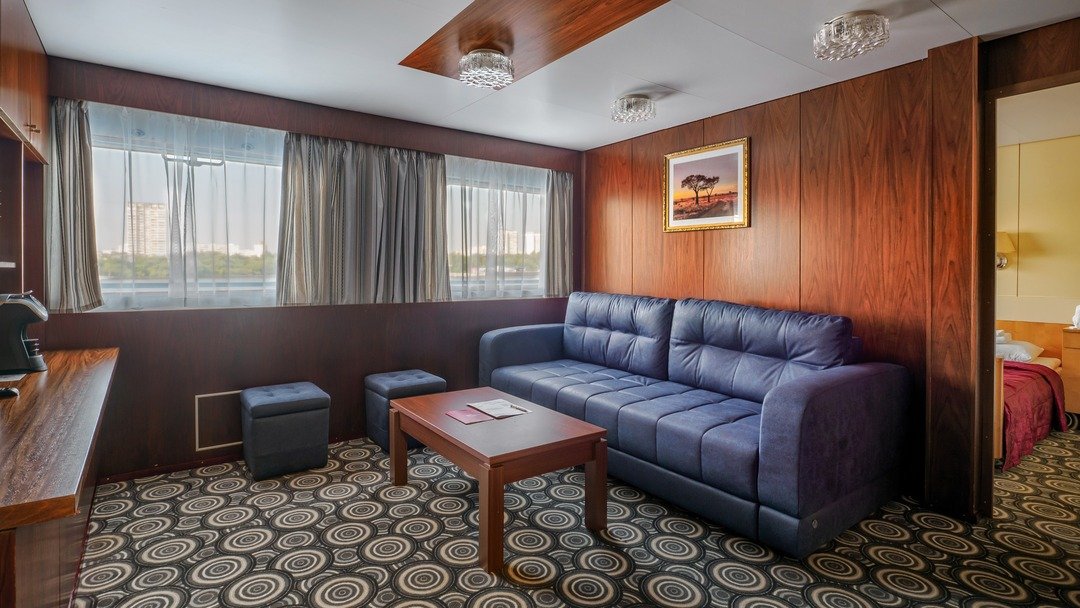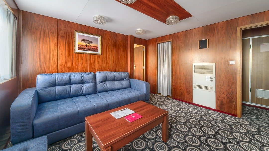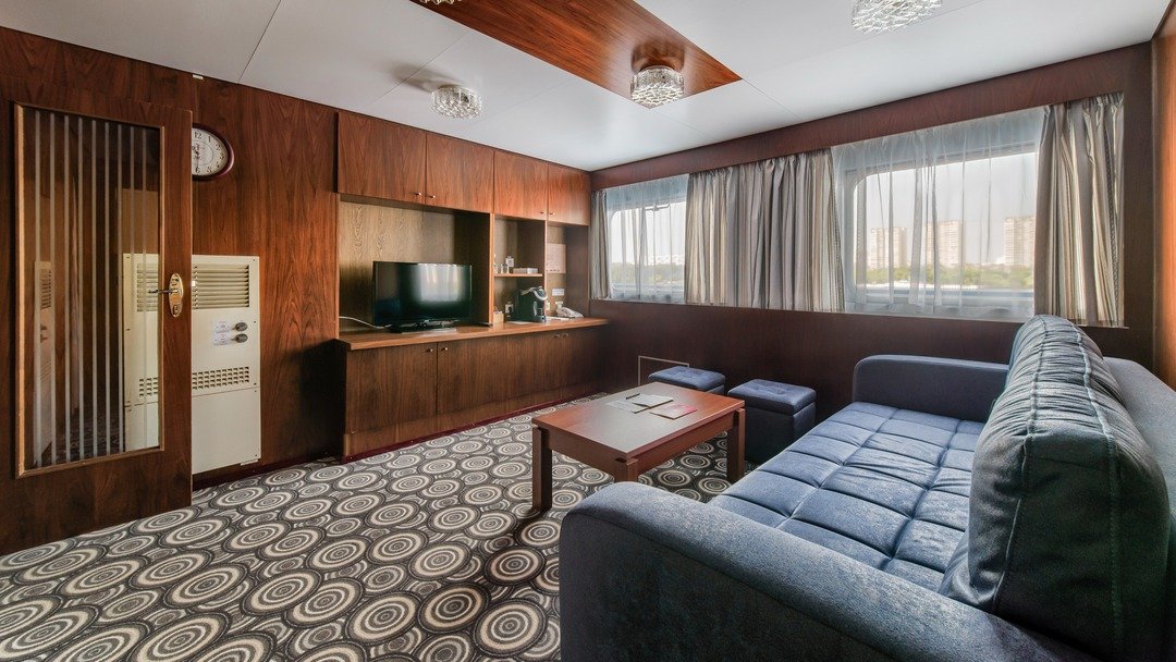 | Шлюпочная палуба | Люкс двухместный Двухкомнатная каюта с удобствами, рассчитаная на размещение от двух до трёх человек Двухкомнатная каюта с удобствами (душ, санузел, кондиционер). Каюта рассчитана на размещение двух человек ( возможно добавить два дополнительных платных места). В гостиной: мягкая мебель (диван), шкафы для одежды, телевизор, холодильник, радио, мини-кухня, два обзорных окна, электророзетка на 220V. В спальне: двуспальная кровать, обзорное окно. Дополнительные привилегии для гостей кают класса «Люкс»: — капсульная кофемашина – 1 капсула в день на человека (по количеству гостей в каюте); — игристое вино (1 бутылка на каюту) в день посадки, без пополнения, только в рейсах от 5 дней; — чайный набор в рейсах любой продолжительности (ежедневное пополнение).Площадь каюты - 26,87 кв.м. (спальня - 9,66 кв.м, гостиная - 17, 21 кв.м.). | 2-местное размещение | нет |