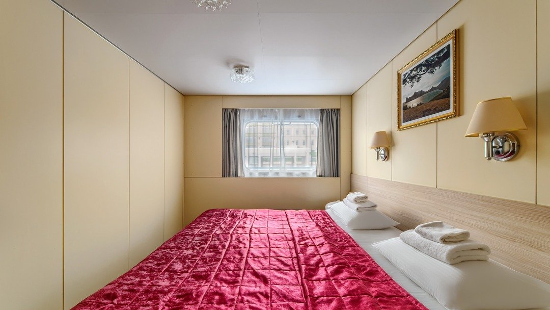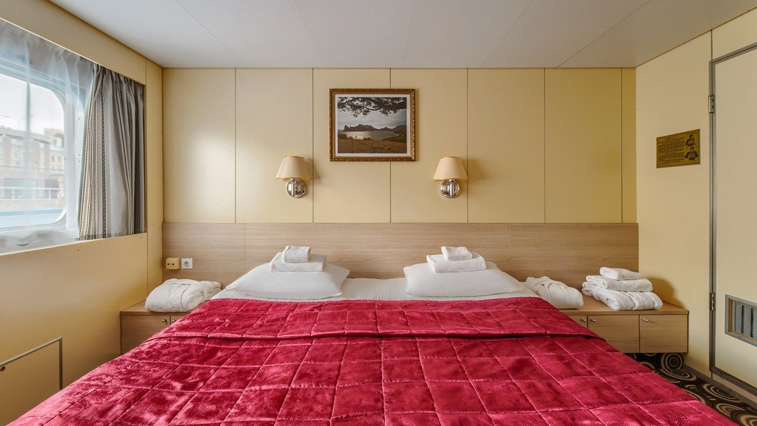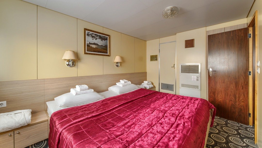 | Средняя палуба | Двухместная Однокомнатная одноярусная каюта, рассчитанная на размещение двух человек В каюте: два спальных места, шкаф для одежды, холодильник, радио, душ, санузел, кондиционер, обзорное окно, электророзетка на 220V.Площадь кают: главная палуба № 203 - № 236 - 9,02 кв.м., средняя палуба № 315 - № 348, № 351 - №362 - 10,45 кв.м., шлюпочная палуба № 403 - № 430 - 9,87 кв.м. | 2-местное размещение | ✔ |