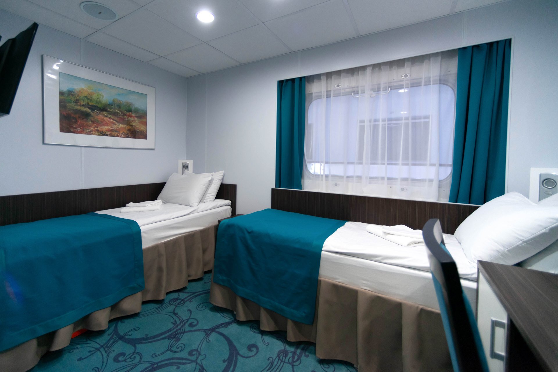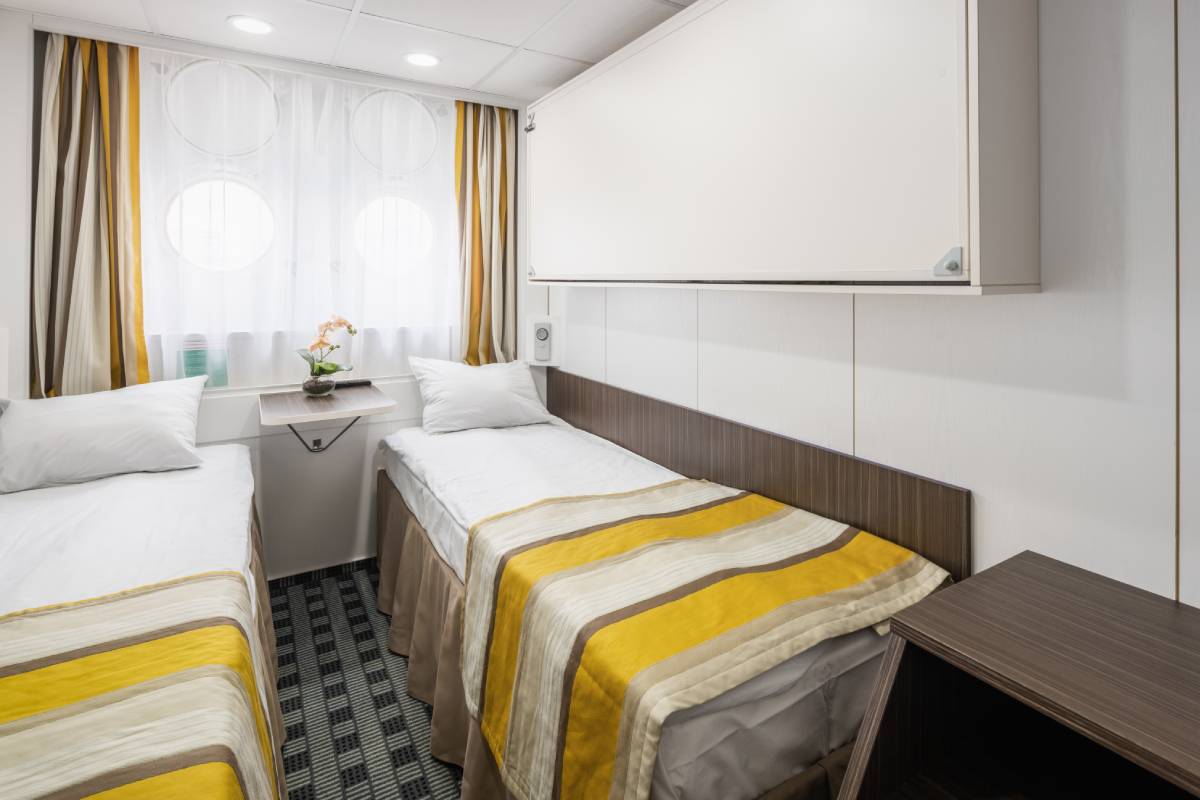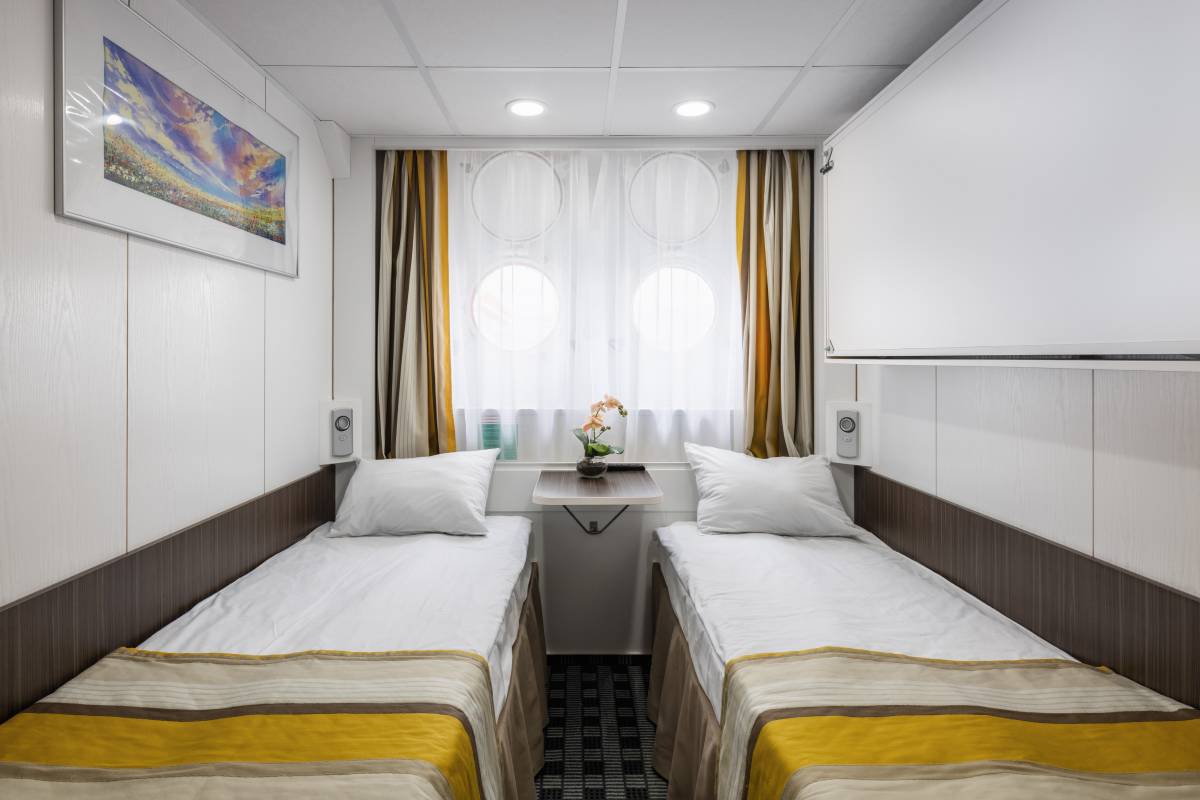 Средняя палуба | Двухместная Однокомнатная одноярусная каюта с удобствами, рассчитанная на размещение от одного до двух человек. В каюте: два спальных места, шкаф для одежды, трюмо, кондиционер, радио, телевизор, холодильник, фен, сейф, обзорное окно, электророзетка на 220V.Расширена площадь санблока, отдельный душ, санузел.Площадь каюты 10,3 м2.Размер кроватей 80х190 см. | 2-местное размещение | нет |