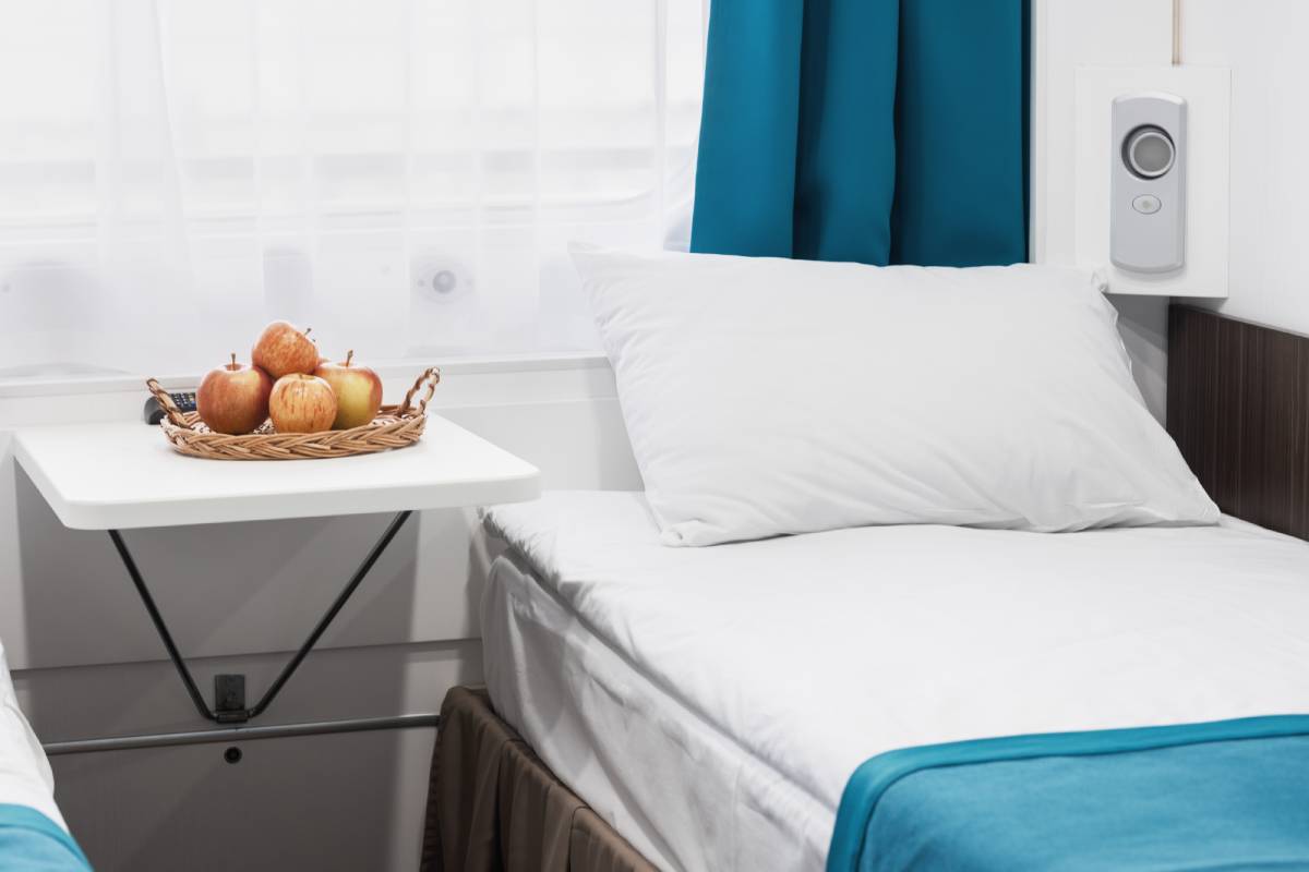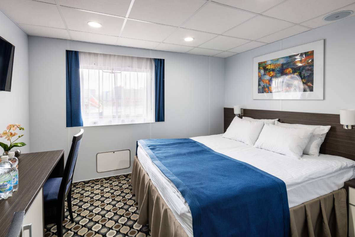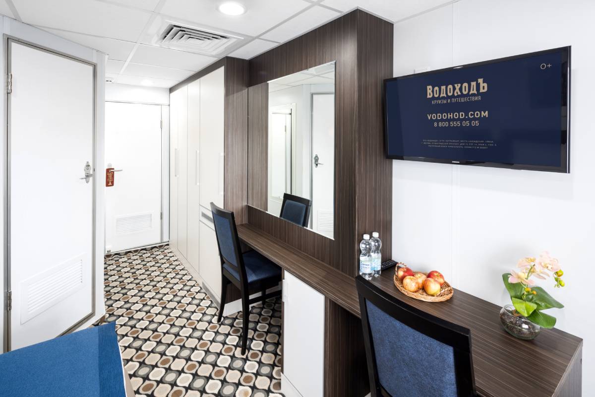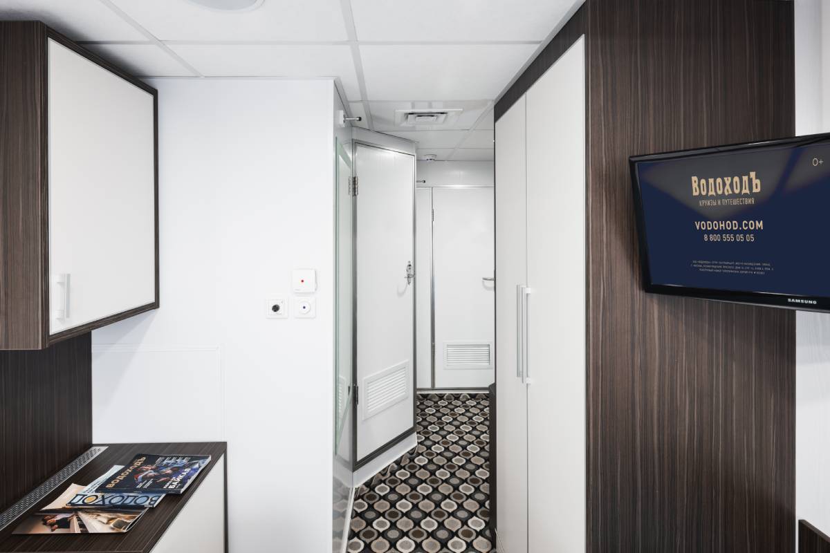 Средняя палуба | Двухместная Однокомнатная одноярусная каюта с удобствами, рассчитанная на размещение от одного до двух человек. В каюте: два спальных места, шкаф для одежды, трюмо, кондиционер, радио, телевизор, холодильник, фен, сейф, обзорное окно, электророзетка на 220V.Расширена площадь санблока, отдельный душ, санузел.Площадь каюты 10,3 м2.Размер кроватей 80х190 см. | 2-местное размещение | нет |