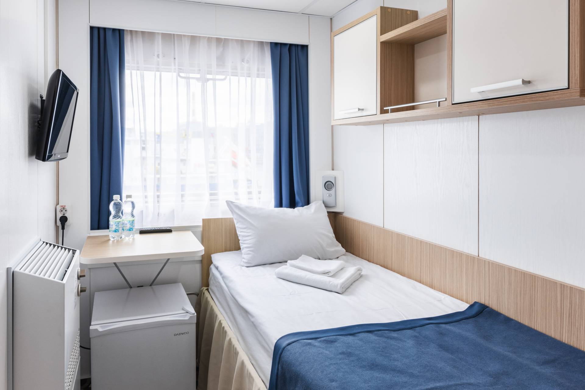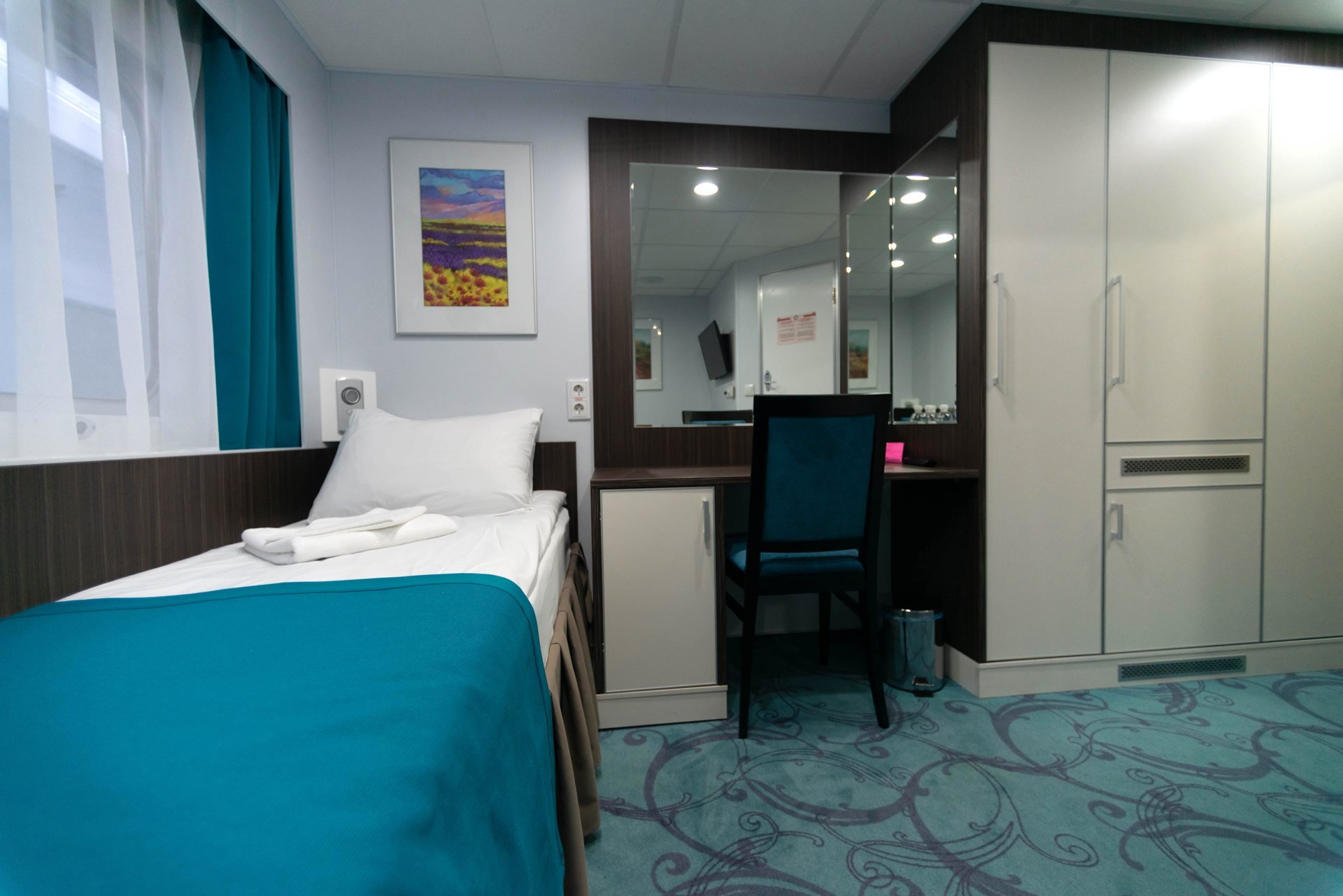 Шлюпочная палуба | Одноместная Однокомнатная каюта с удобствами, рассчитанная на размещение одного человека. В каюте: одно спальное место, шкаф для одежды, кондиционер, радио, телевизор, холодильник, фен, сейф, обзорное окно, электророзетка на 220V, душ, санузел.Площадь кают: 433-436 (шлюпочная палуба) — 7,5 м2, 429-432 (шлюпочная палуба) — 6,4 м2, 365-372 (средняя палуба) — 7,2 м2, 355, 356, 317, 318 (средняя палуба) — 6,4 м2.Размер кроватей 80х190 см. | 1-местное размещение | нет |