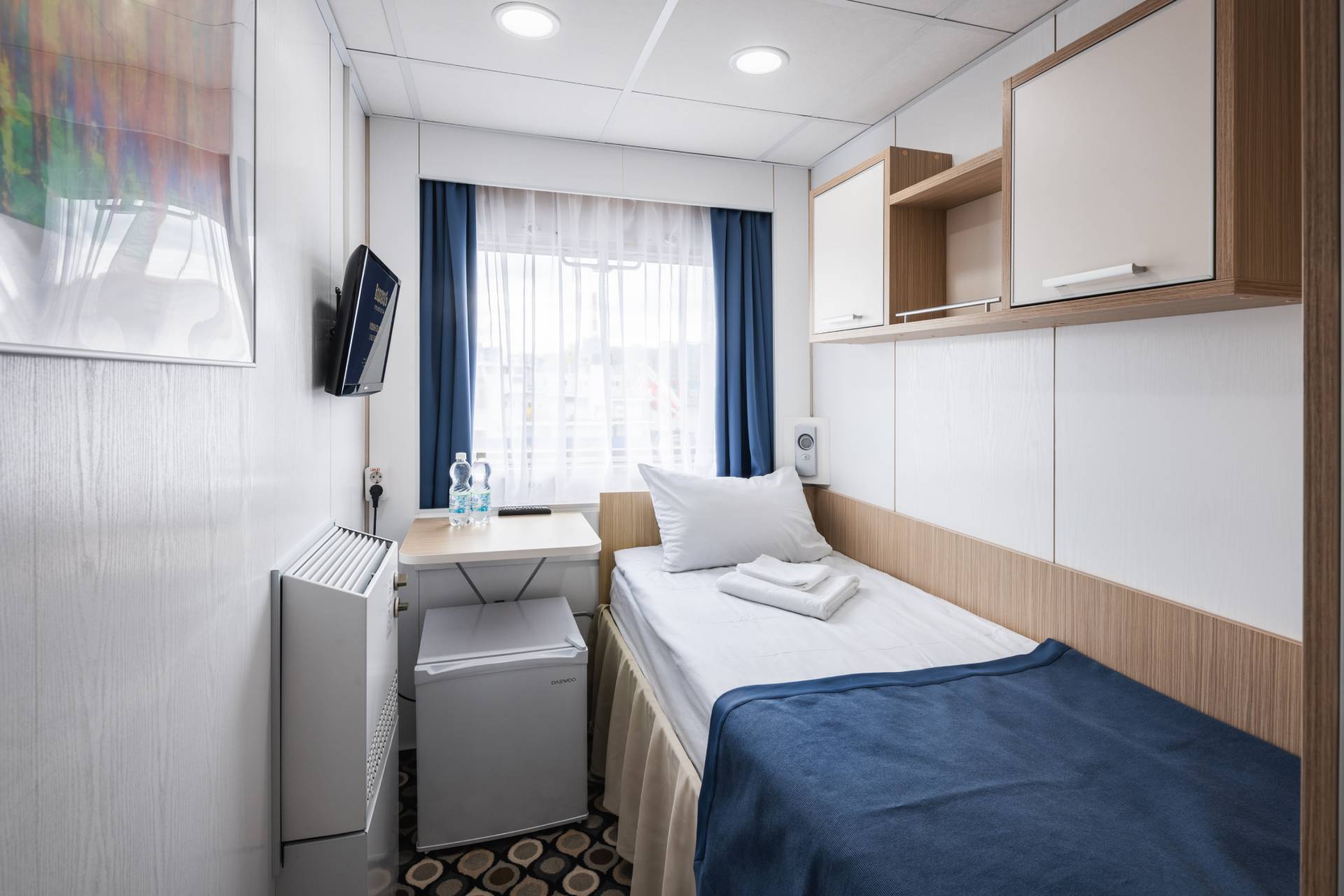 Средняя палуба | Двухместная Однокомнатная одноярусная каюта с удобствами, рассчитанная на размещение от одного до двух человек. В каюте: два спальных места, шкаф для одежды, трюмо, кондиционер, радио, телевизор, холодильник, фен, сейф, обзорное окно, электророзетка на 220V.Расширена площадь санблока, отдельный душ, санузел.Площадь каюты 10,3 м2.Размер кроватей 80х190 см. | 1-местное размещение | нет |