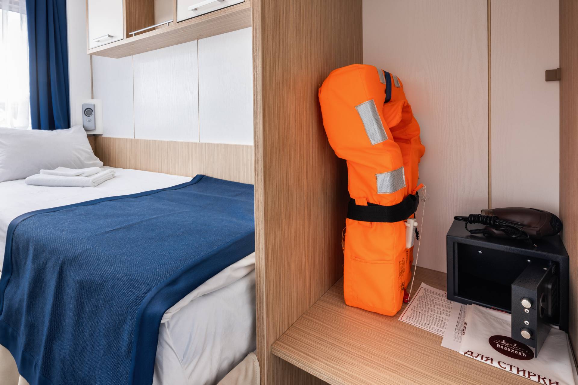 Шлюпочная палуба | Двухместная Однокомнатная одноярусная каюта с удобствами, рассчитанная на размещение от одного до двух человек. В каюте: два спальных места, шкаф для одежды, трюмо, кондиционер, радио, телевизор, холодильник, фен, сейф, обзорное окно, электророзетка на 220V.Расширена площадь санблока, отдельный душ, санузел.Площадь каюты 10,3 м2.Размер кроватей 80х190 см. | 1-местное размещение | нет |