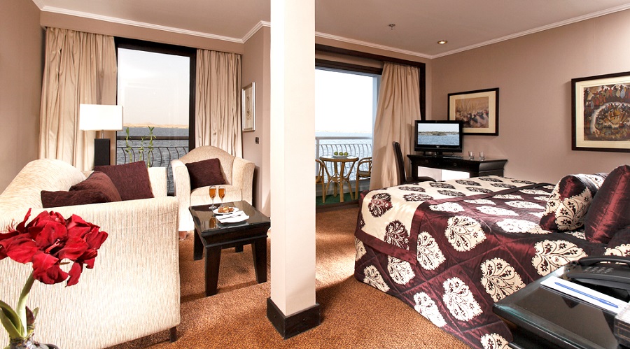 Палуба 2 | Royal Suite К категории Royal Suite относятся каюты: Malika, Shahrazad, Sultana, Amira.Двухкомнатная двухместная каюта со всеми удобствами, расположенная на второй и третьей палубах.Площадь каюты ≈ 70 м². Соответствие кают с теплоходом Crown Jubilee: Omar El Khayam Crown Jubilee Malika Royal Suite 409 Standard Shahrazad Royal Suite 410 Standard Sultana Royal Suite 411 Standard Amira Royal Suite 412 Standard Бутилированная вода – ежедневное пополнение (0,5 л/чел). Есть возможность поставить дополнительную кровать для ребенка. В каюте: одна двуспальная кровать (при необходимости трансформируется в две односпальные кровати), ванная комната (раковина, джакузи, туалет), фен, тумбочки, шкаф для одежды, стол, пуф, мягкая мебель, журнальный столик, телевизор, кондиционер, холодильник, тапочки, халат, туалетные принадлежности, розетки 220V, сейф, панорамные окна, стеклянная балконная дверь-окно, персональный балкон с мебелью для отдыха. | 2-местное размещение | ✔ |
