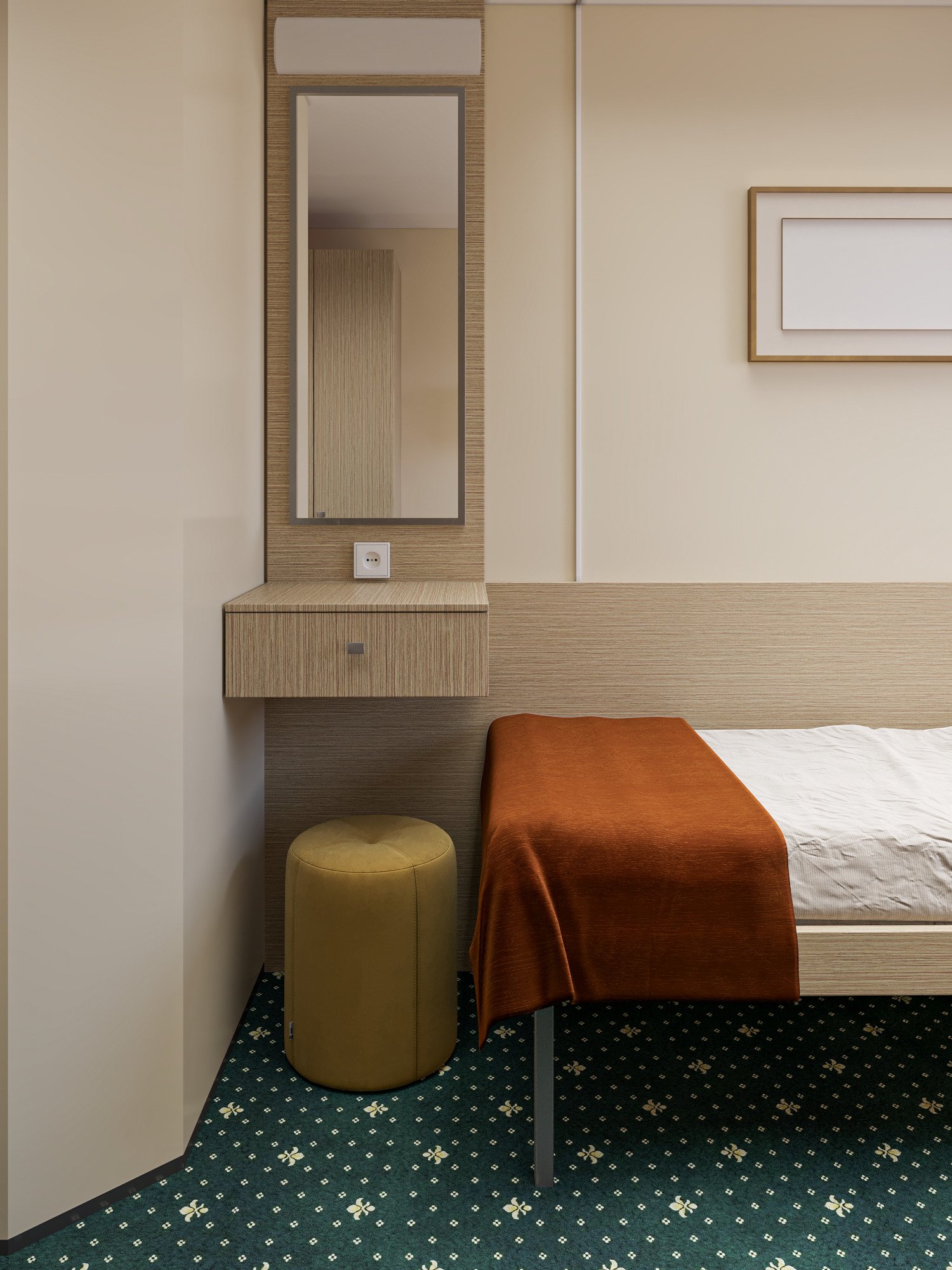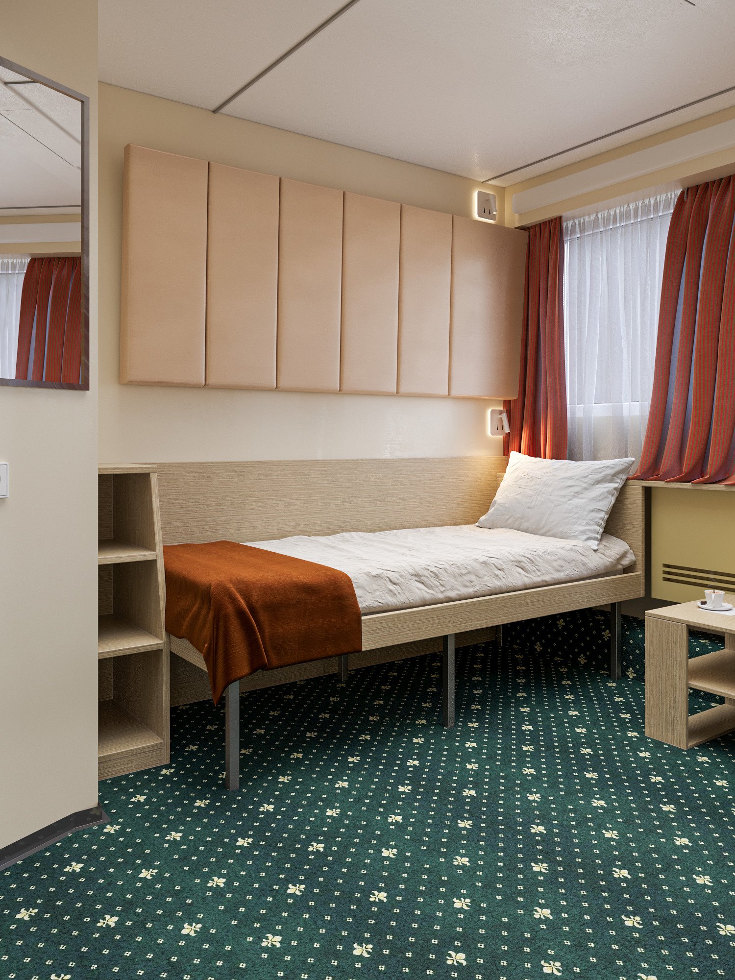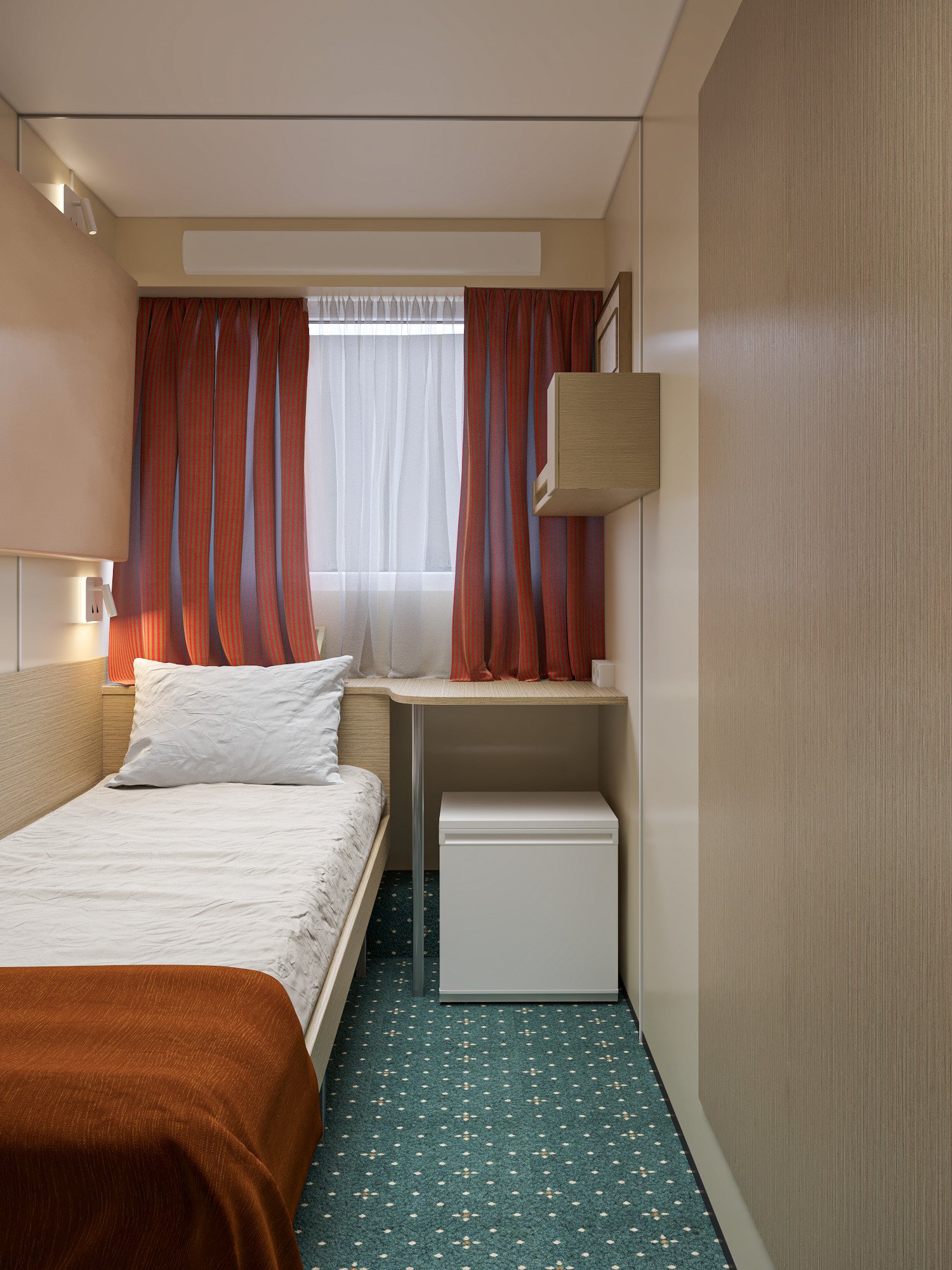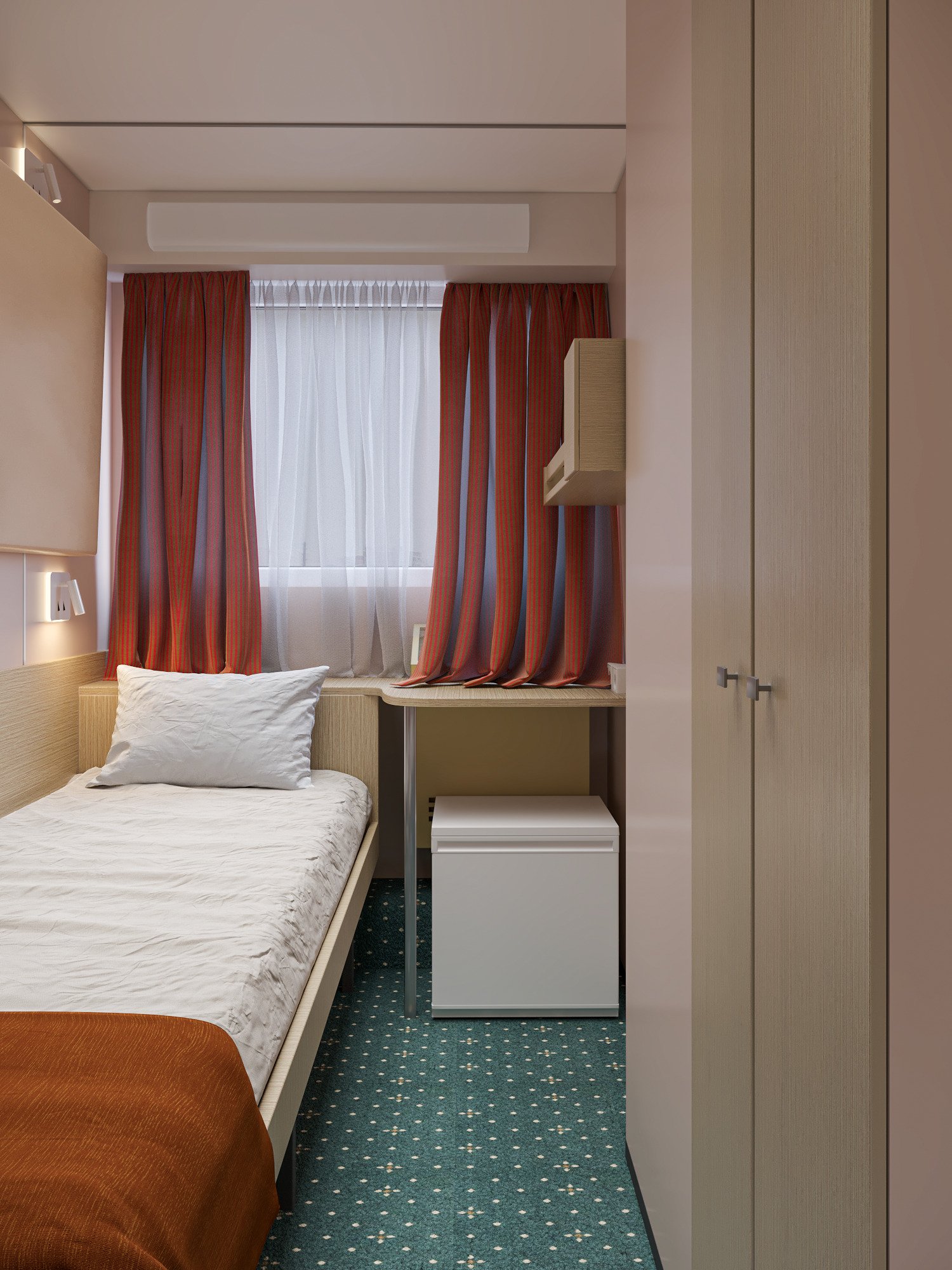 | Средняя палуба | Двухместная двухъярусная Однокомнатная двухъярусная каюта с удобствами, рассчитанная на размещение двух человек В каюте: два спальных места (одно над другим), шкаф для одежды, зеркало, радио, фен, душ, санузел, холодильник, кондиционер, обзорное окно, электророзетка на 220V.Площадь кают:183-191 (главная палуба) — 6 м281,86, 108-117, 146, 147 (средняя палуба) — 6 м2, 73-76 — 7,4 м231-32 (шлюпочная палуба) — 6 м2Размер кроватей: нижняя 80х200 см, верхняя 75х200 смВ 2026 году каюты теплохода будут модернизированы. Перед вами — визуализация будущих интерьеров. | 1-местное размещение | нет |