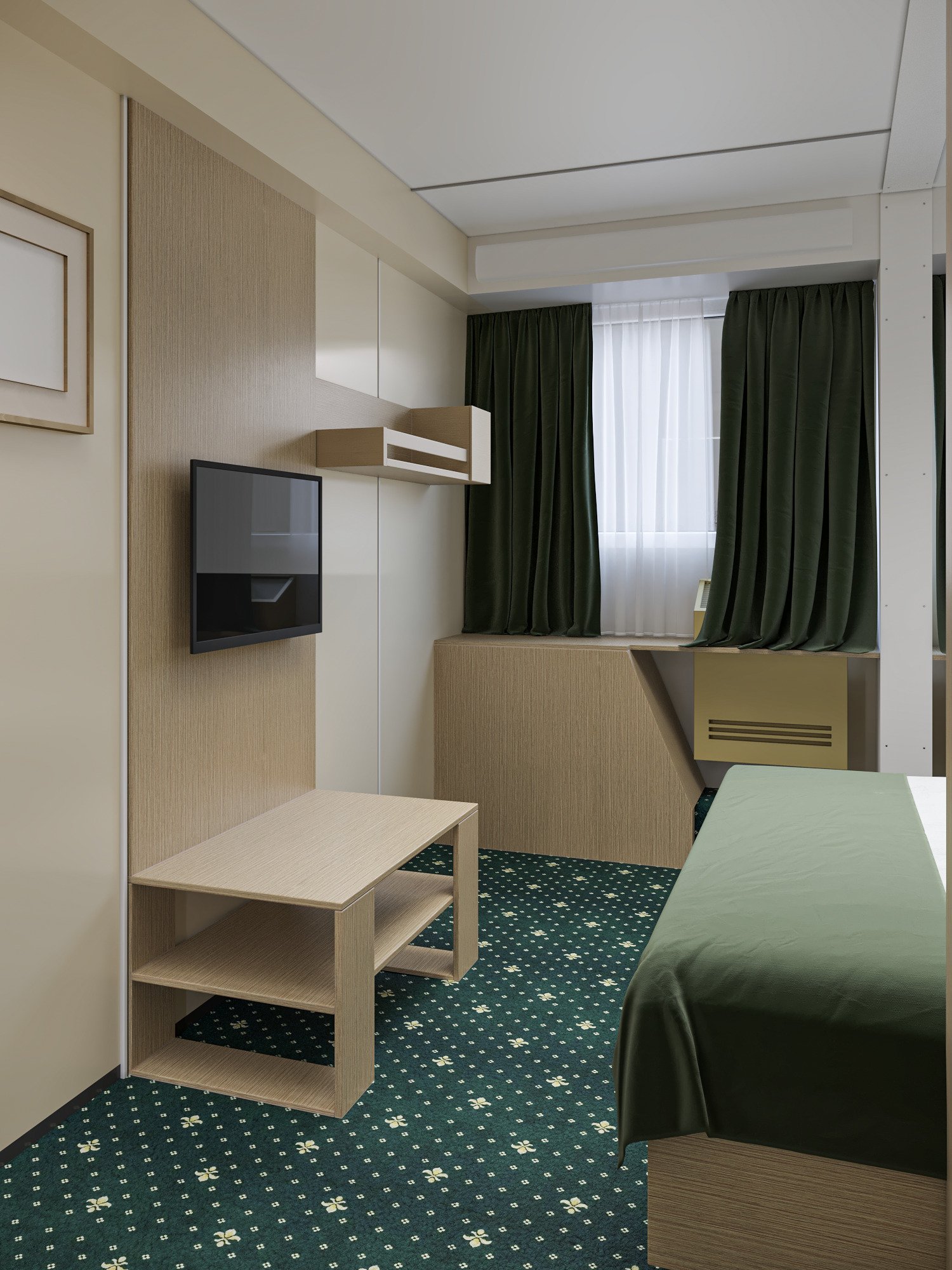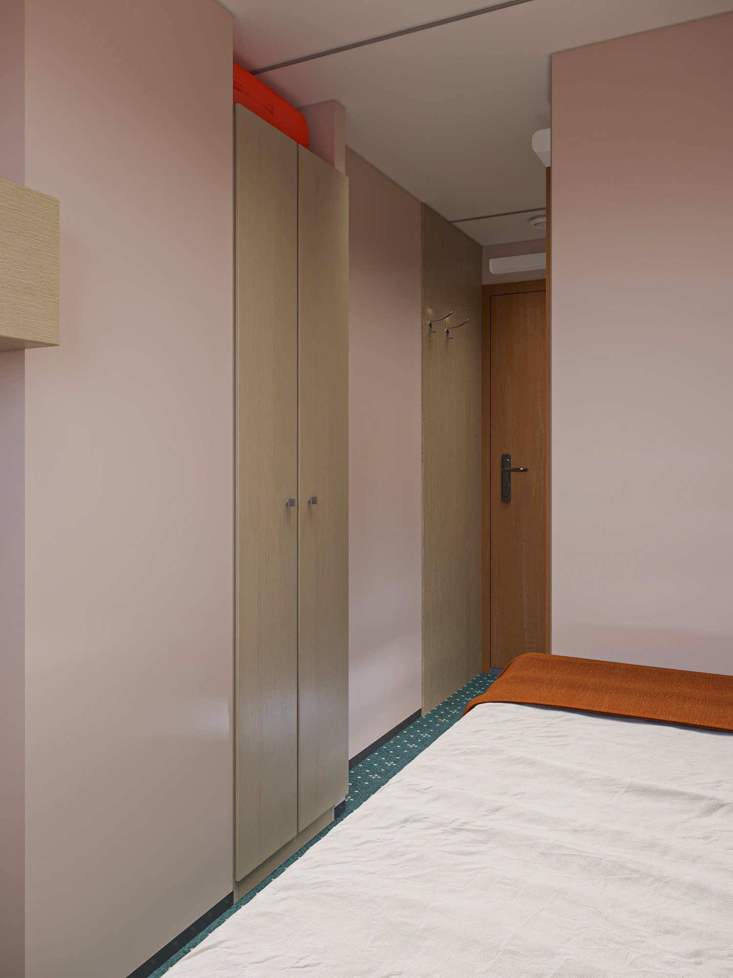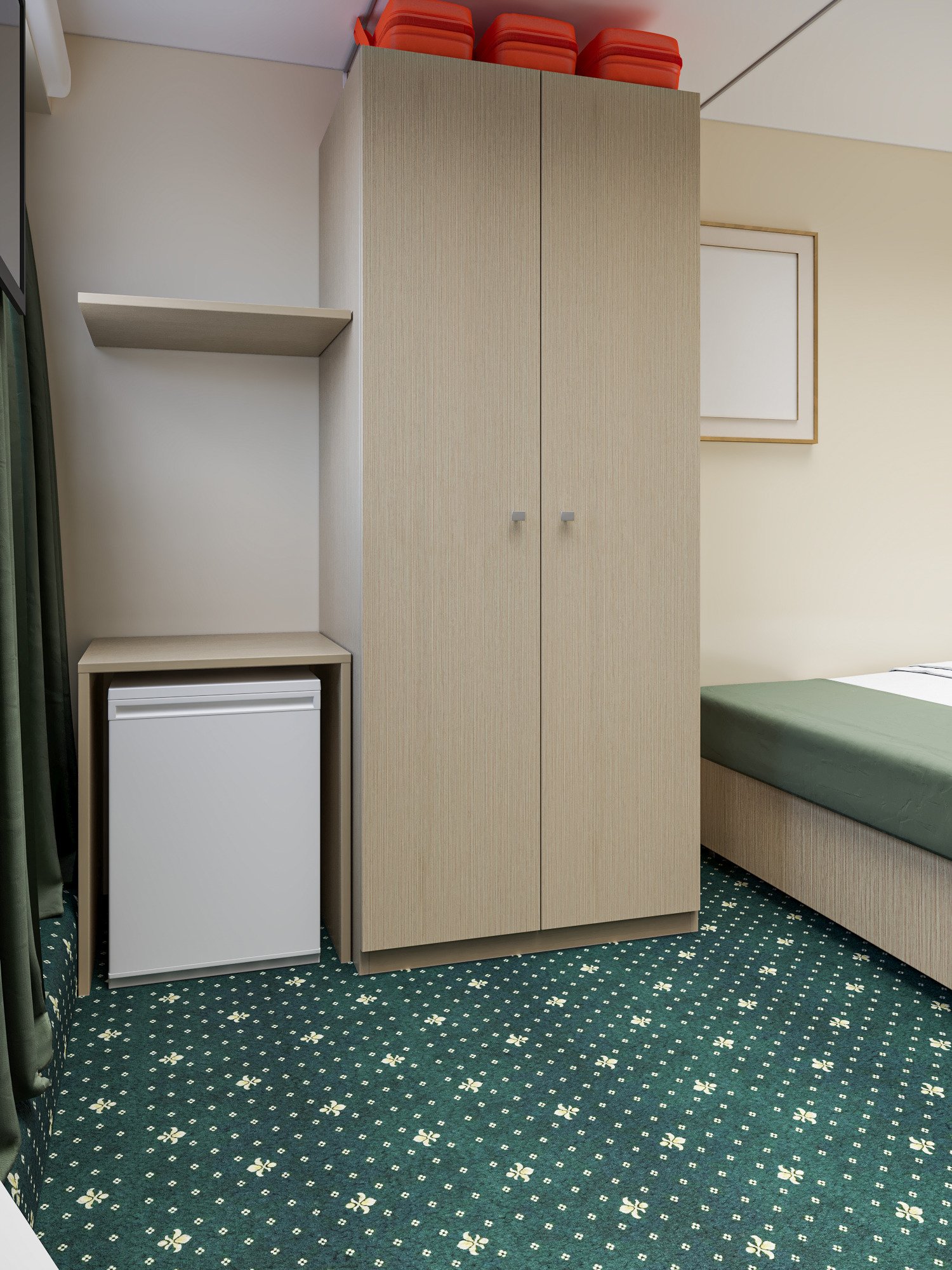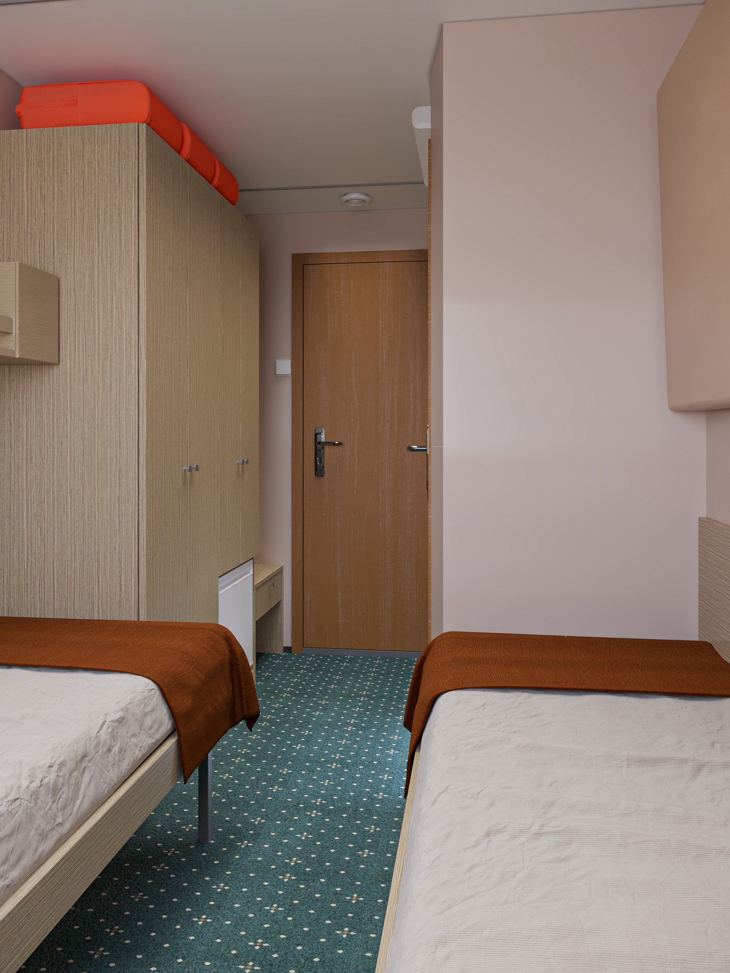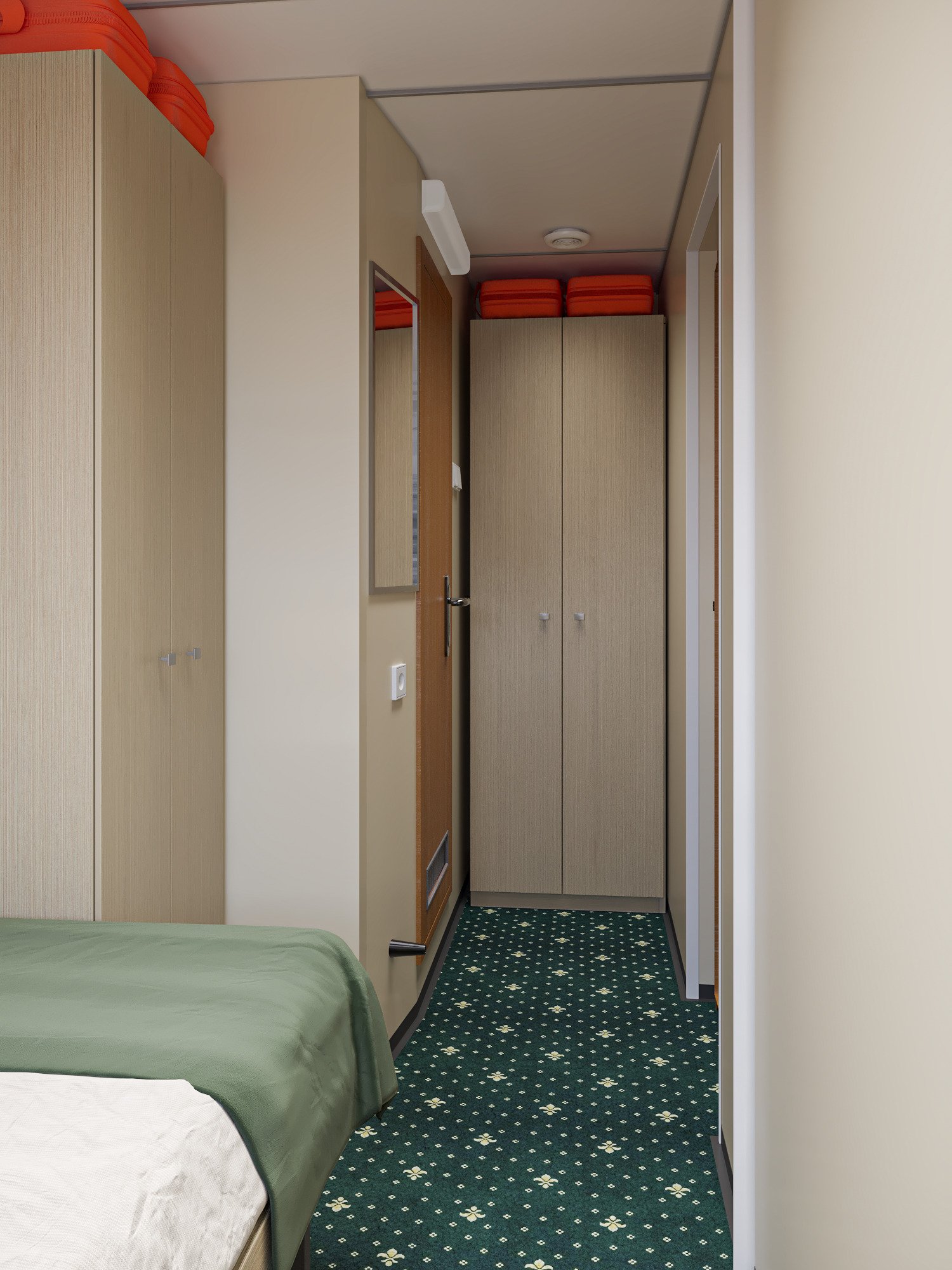 | Средняя палуба | Двухместная двухъярусная Однокомнатная двухъярусная каюта с удобствами, рассчитанная на размещение двух человек В каюте: два спальных места (одно над другим), шкаф для одежды, зеркало, радио, фен, душ, санузел, холодильник, кондиционер, обзорное окно, электророзетка на 220V.Площадь кают:183-191 (главная палуба) — 6 м281,86, 108-117, 146, 147 (средняя палуба) — 6 м2, 73-76 — 7,4 м231-32 (шлюпочная палуба) — 6 м2Размер кроватей: нижняя 80х200 см, верхняя 75х200 смВ 2026 году каюты теплохода будут модернизированы. Перед вами — визуализация будущих интерьеров. | 1-местное размещение | нет |