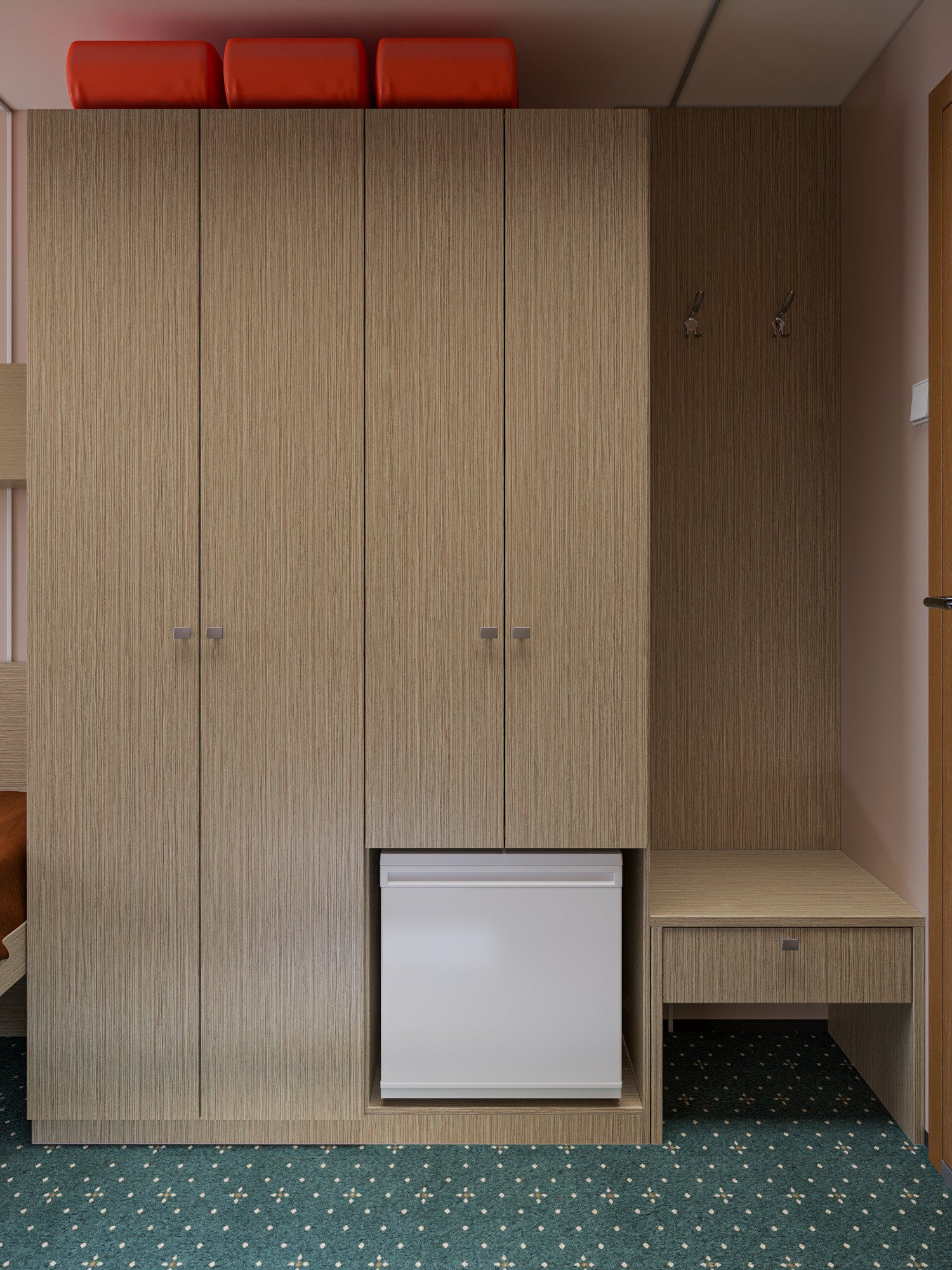 | Главная палуба | Трехместная двухъярусная Однокомнатная двухъярусная каюта с удобствами, рассчитанная на размещение трех человек В каюте: три спальных места (два внизу, третье вторым ярусом), шкаф для одежды, зеркало, радио, фен, душ, санузел, холодильник, кондиционер, обзорное окно, электророзетка на 220V.Площадь кают:153-161 (главная палуба) — 10,4 м2, 169-181 (главная палуба) — 8,4 м277-80 (средняя палуба) — 8,4 м2Размер кроватей: нижняя 75х200 см, верхняя 75х200 смВ 2026 году каюты теплохода будут модернизированы. Перед вами — визуализация будущих интерьеров. | 3-местное размещение | нет |