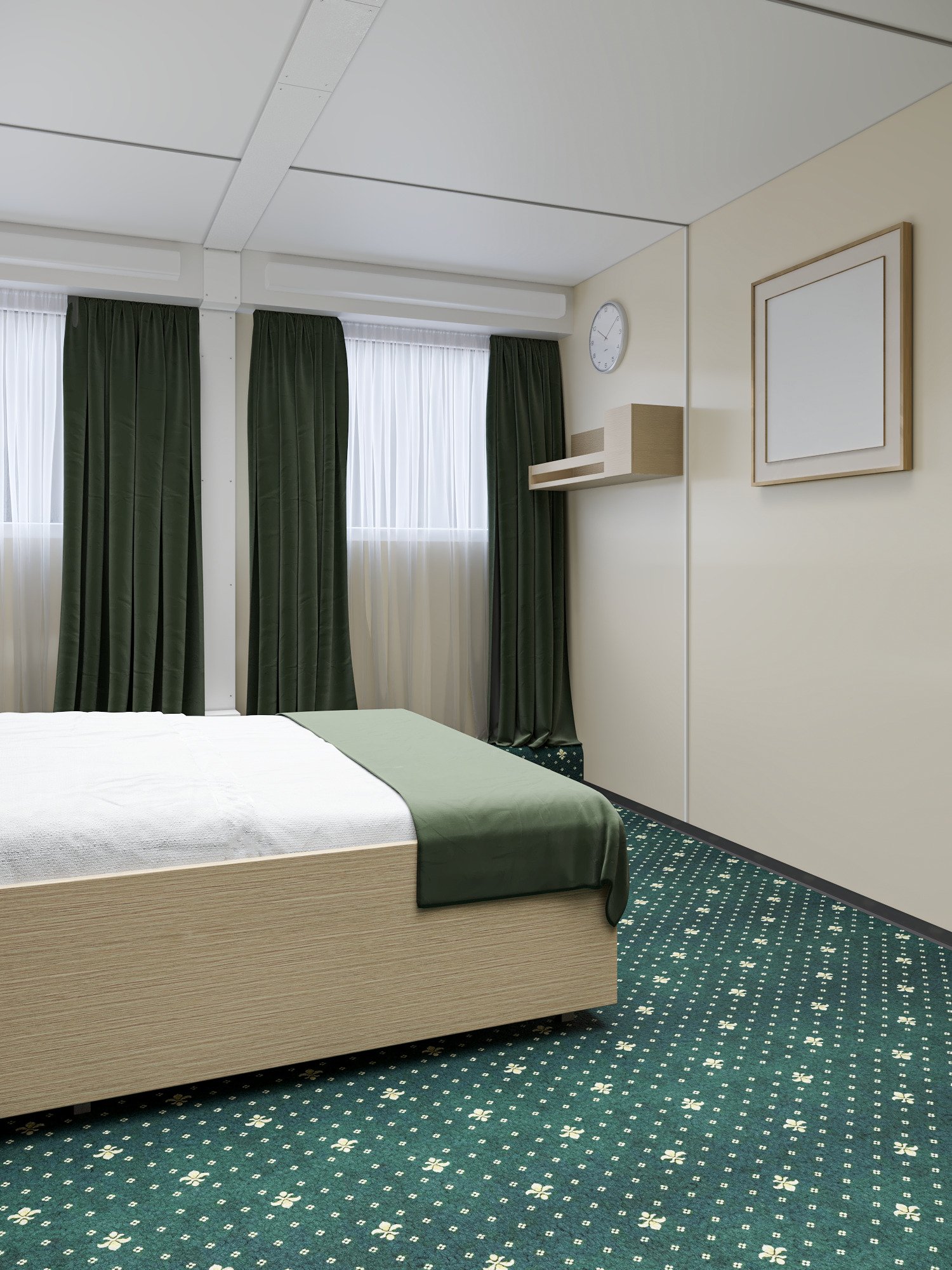 | Средняя палуба | Двухместная одноярусная каюта «А» Просторная однокомнатная каюта с удобствами, рассчитанная на размещение двух человек В каюте: двуспальная кровать, шкаф для одежды, холодильник, телевизор, фен, душ, санузел, кондиционер, радио, два обзорных окна, электророзетка на 220V.Площадь кают от 13 м2 до 16 м2Размер кровати 140х200 смВ 2026 году каюты теплохода будут модернизированы. Перед вами — визуализация будущих интерьеров. | 2-местное размещение | нет |
