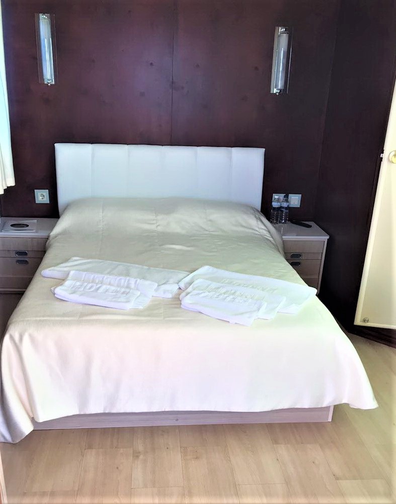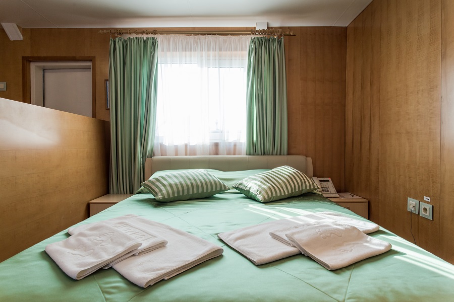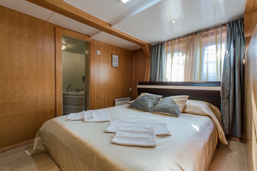 | Верхняя палуба | 2-местная (верхняя палуба) К категории 2-местная (верхняя палуба) относится каюта: 405.Двухместная каюта со всеми удобствами, расположенная на верхней палубе.Площадь каюты ≈ 11 м². Размер кровати – 160х200 см. Вход и выход из каюты осуществляется с палубы. В каюте: одна двуспальная кровать, две прикроватные тумбы, телевизор со встроенным DVD, шкаф для одежды, ванная комната (раковина, душ, туалет) в одной зоне, фен, розетки 220V, прикроватные светильники, телефон (звонки по теплоходу), обогреватель, обзорное окно. | 2-местное размещение | нет |