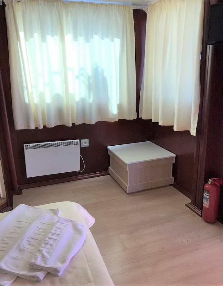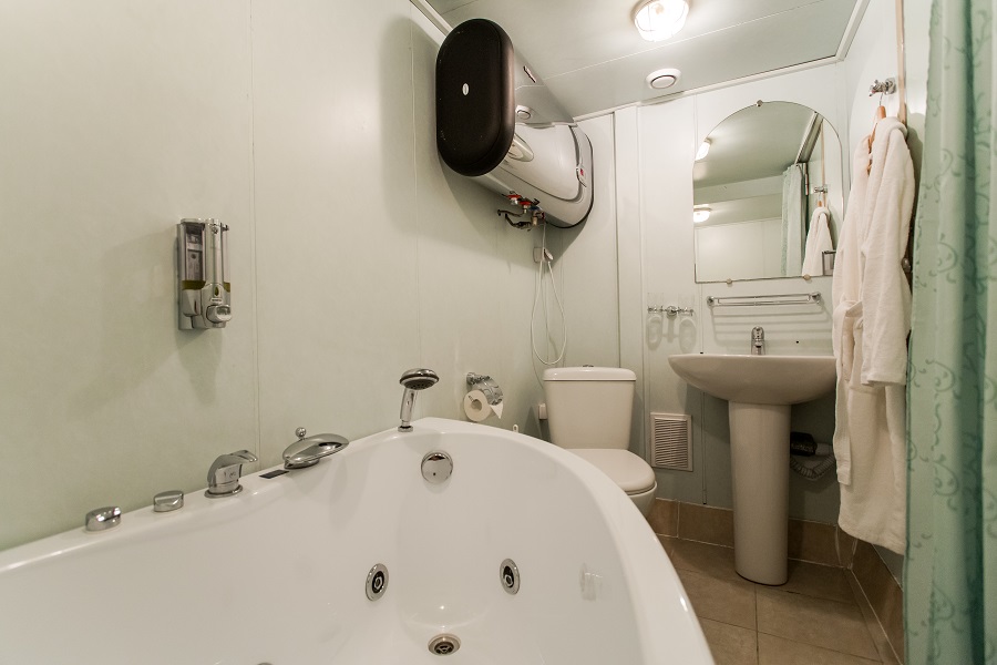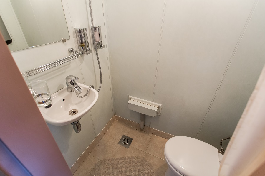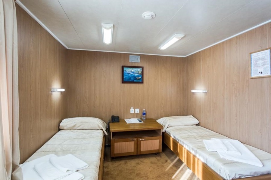 | Нижняя палуба | 2-местная (нижняя палуба) К категории 2-местная (нижняя палуба) относятся каюты: 203–208, 210.Двухместная каюта twin со всеми удобствами, расположенная на нижней палубе.Площадь каюты ≈ 9 м². Размер кроватей – 80х200см. В каюте: две раздельные одноместные кровати (параллельно вдоль стены), прикроватная тумба, телевизор со встроенным DVD, шкаф для одежды, ванная комната (раковина, душ, туалет) в одной зоне, фен, розетки 220V, прикроватные светильники, телефон (звонки по теплоходу), обогреватель, обзорное окно (не открывается). | 2-местное размещение | нет |