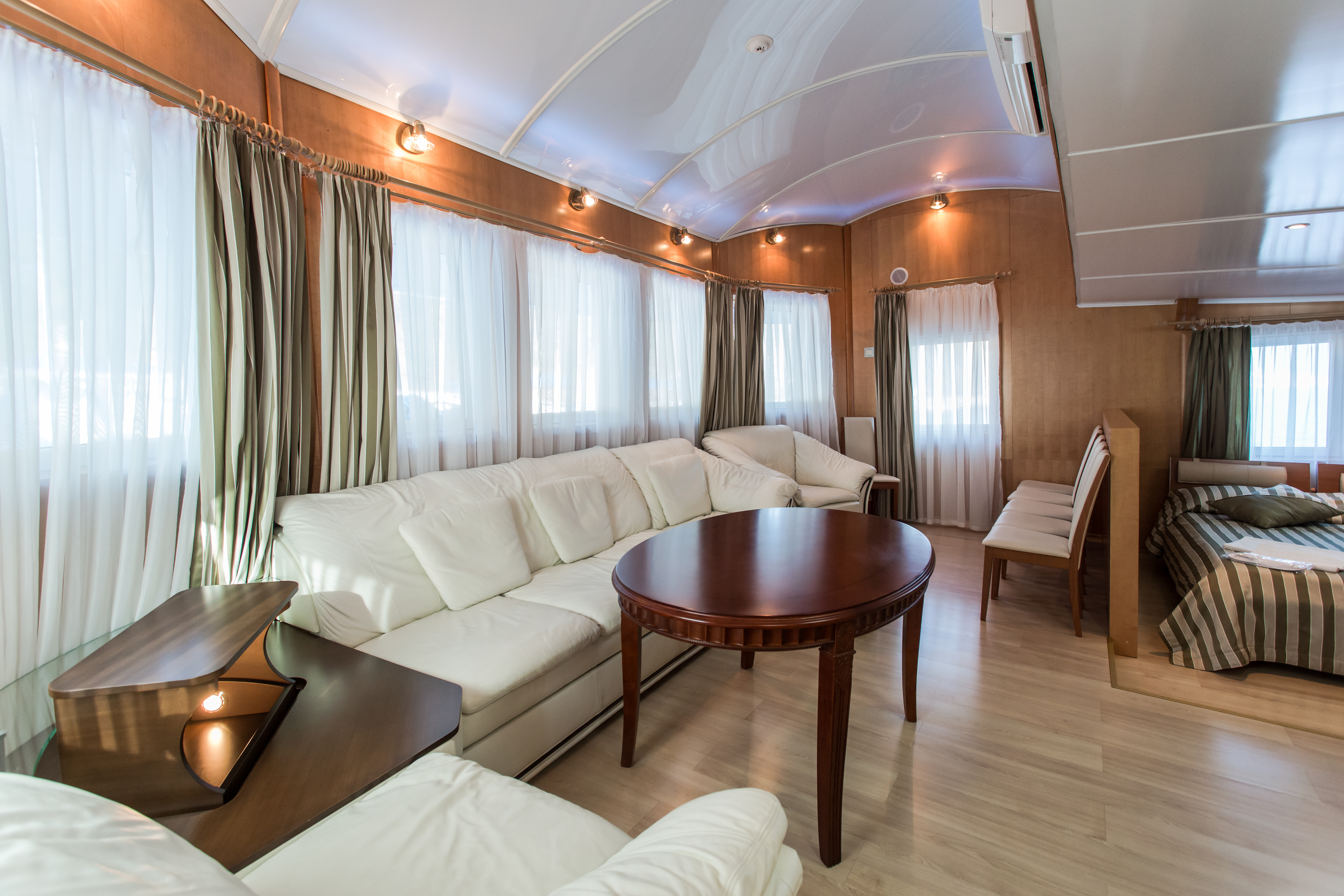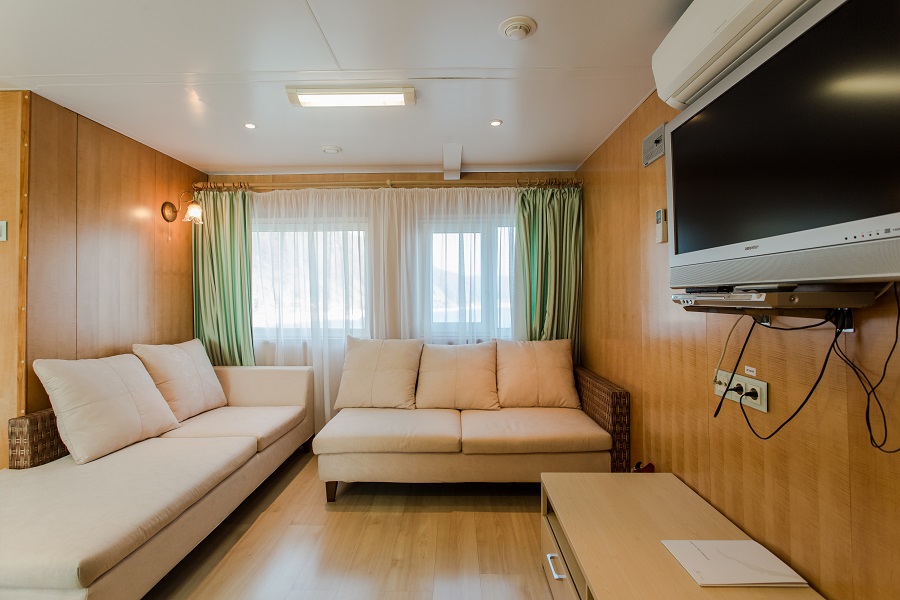 | Главная палуба | Люкс (главная палуба) К категории Люкс относится каюта: 301.Двухместная каюта повышенной комфортности со всеми удобствами, расположенная на главной палубе.Площадь каюты ≈ 31 м². Размер кроватей – 160х200 см. Возможно размещение третьего человека на дополнительном спальном месте – диван. В каюте: двуспальная кровать, прикроватные тумбочки, прикроватные светильники, шкаф для одежды, угловой диван, два кресла, большой круглый стол, стулья, тумба под ТВ, телевизор, журнальный столик, DVD, ванная комната (джакузи, раковина, туалет), фен, розетки 220V телефон (звонки по теплоходу), обогреватель, кондиционер, мини-бар, обзорные окна. | 2-местное размещение | нет |