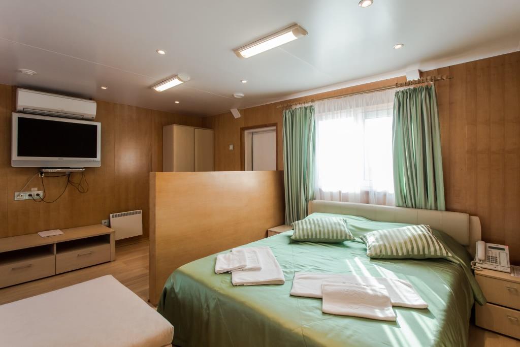 | Верхняя палуба | Люкс (верхняя палуба) К категории Люкс относятся каюты: 401, 403. Двухместная каюта повышенной комфортности со всеми удобствами, расположенная на верхней палубе.Площадь каюты ≈ 22 м². Размер кровати – 160х200 см. Возможно размещение ребенка до 10 лет на дополнительном спальном месте (диван, не раскладывается). Вход и выход из каюты осуществляется с палубы. В каюте: двуспальная кровать, две прикроватные тумбочки, шкаф для одежды, диван, кресло, тумба под ТВ, телевизор, DVD, ванная комната (джакузи, раковина, туалет), фен, розетки 220V, телефон (звонки по теплоходу), обогреватель, кондиционер, мини-бар, обзорные окна. | 2-местное размещение | ✔ |