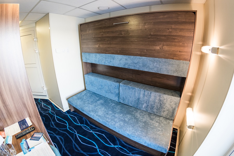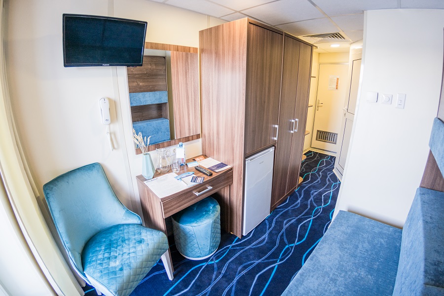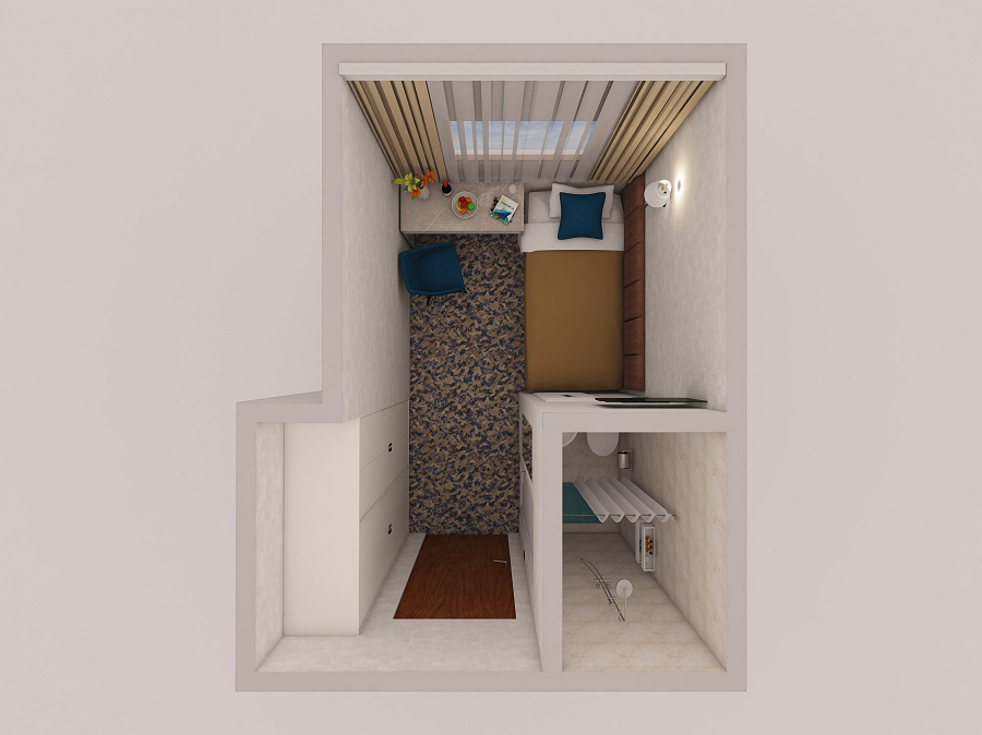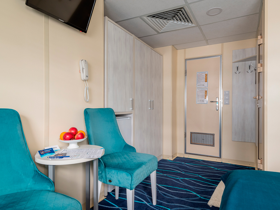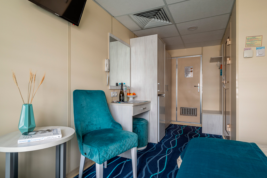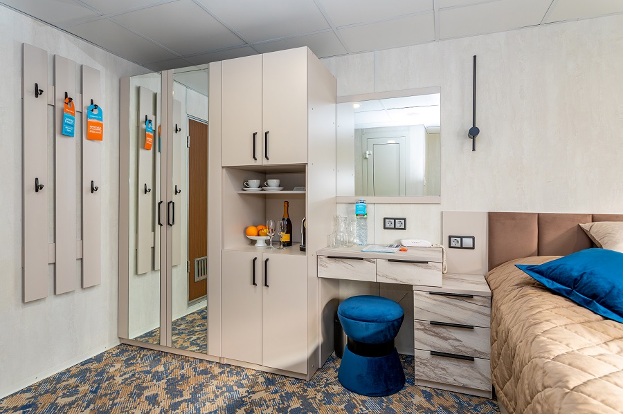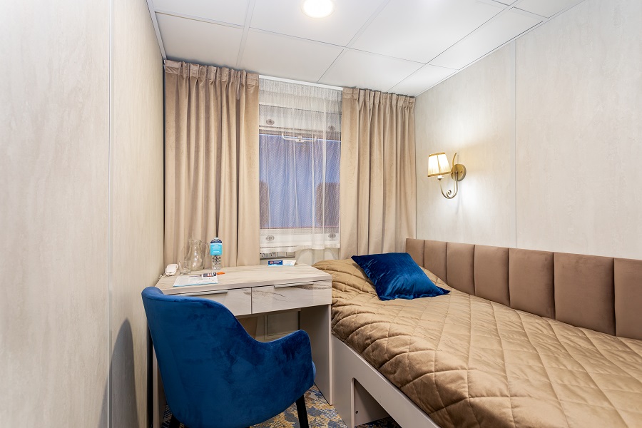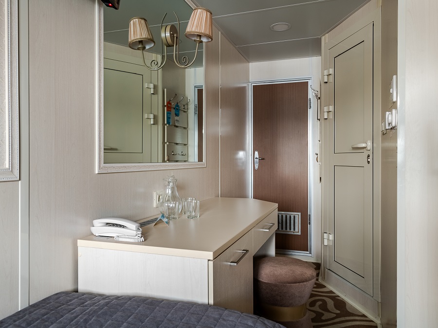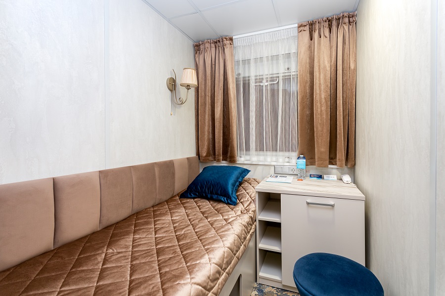 | Средняя палуба | А1 комфорт + К категории А1 комфорт + относятся каюты: 311, 312.Одноместная каюта увеличенной площади со всеми удобствами, расположенная на средней палубе. Площадь каюты ≈ 8,7 м².В каюте: увеличенная односпальная кровать, ванная комната (раковина, душ, туалет), стол, кресло, зеркало, шкаф для одежды, телевизор с приемом спутниковых каналов, радио, телефон внутренней связи, холодильник, кондиционер, сейф, фен, розетки 220 V, обзорное окно.Также к услугам гостей: набор бокалов и графин для воды, чайная пара, тапочки, диспенсер с жидким мылом и гелем, дорожный набор, щетка для одежды, плед для каждого туриста. | 1-местное размещение | нет |