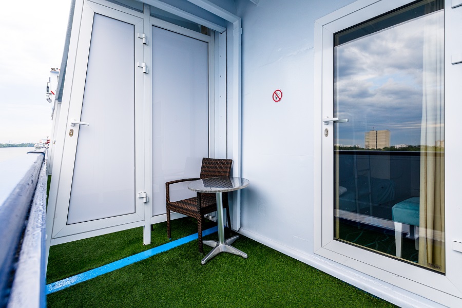 | Шлюпочная палуба | А1+ с балконом К категории А1+ с балконом относятся каюты: 409, 410, 419, 420, 423. Одноместная каюта с балконом со всеми удобствами, расположенная на шлюпочной палубе. Площадь каюты от 13,5 до 14,4 м² (включая балкон ≈ 4,3 м²). Возможно размещение второго человека на дополнительном месте – откидная полка. В каюте: односпальная кровать, дополнительное спальное место верхнего расположения (откидная полка), ванная комната (раковина, душ, туалет), кресло, туалетный стол, пуф, шкаф, холодильник, радио, фен, плед для каждого туриста, телевизор с кабельным и спутниковым вещанием, кондиционер, розетки 220 V, щетка для одежды, стеклянная балконная дверь-окно, персональный балкон с мебелью для отдыха. | 1-местное размещение | ✔ |