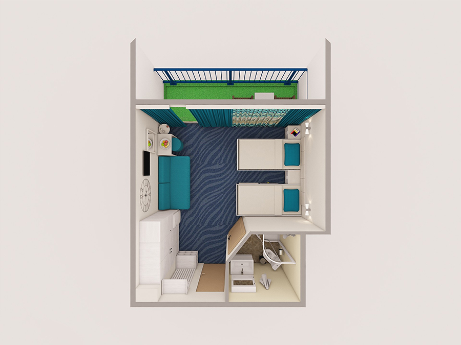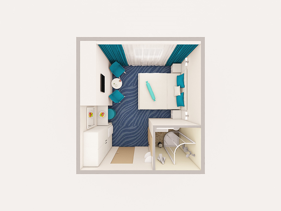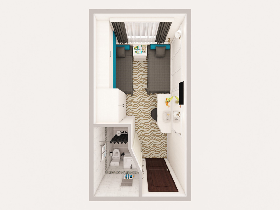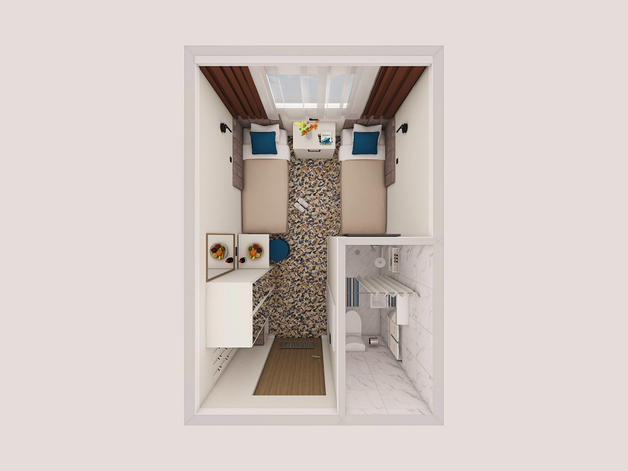 | Главная палуба | А2 комфорт (главная палуба) НОВИНКА 2026. Данное изображение каюты является рендером и несет ознакомительный характер.К категории А2 комфорт (главная палуба) относятся каюты: 210, 212–229. Двухместная каюта со всеми удобствами, расположенная на главной палубе. Площадь каюты ≈ 9,5 м².В каюте: две односпальные кровати, ванная комната (раковина, душ, туалет), прикроватная тумба, шкаф для одежды, стол, мягкий пуф, вешалка для верхней одежды, зеркало, радио, телевизор с кабельным и спутниковым вещанием, телефон, холодильник, тапочки, фен, набор посуды, пледы для каждого туриста, щетка для одежды, розетки 220 V, кондиционер, обзорное окно. | 2-местное размещение | ✔ |
