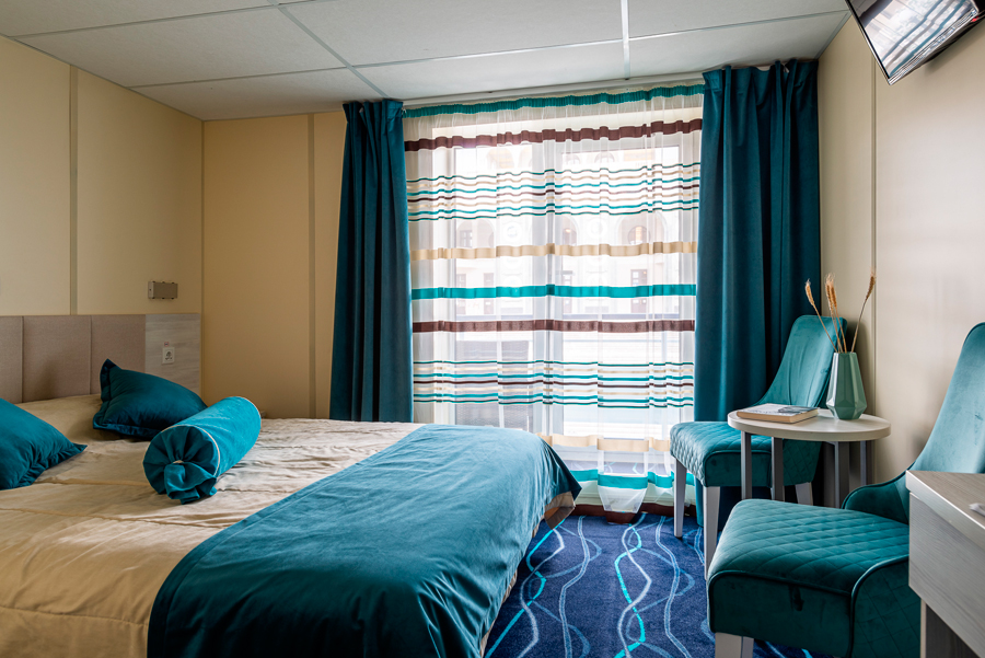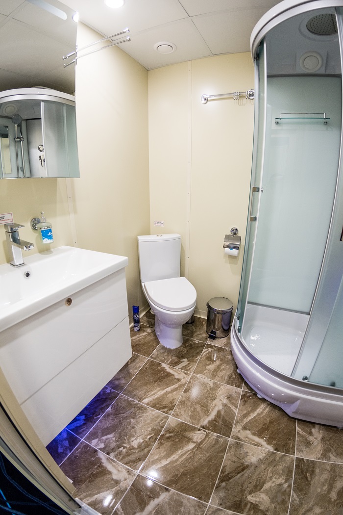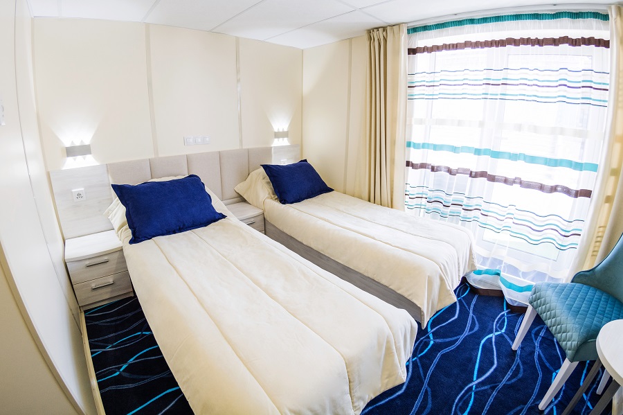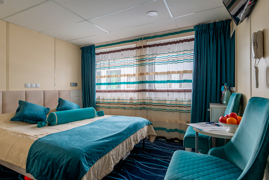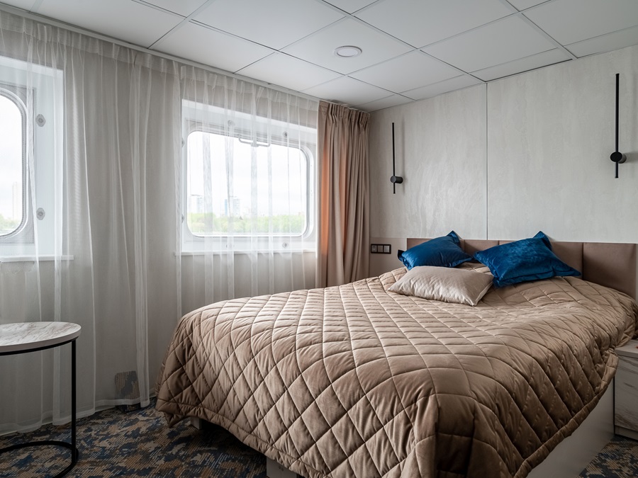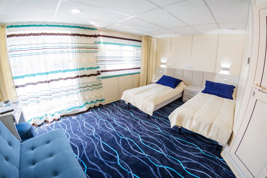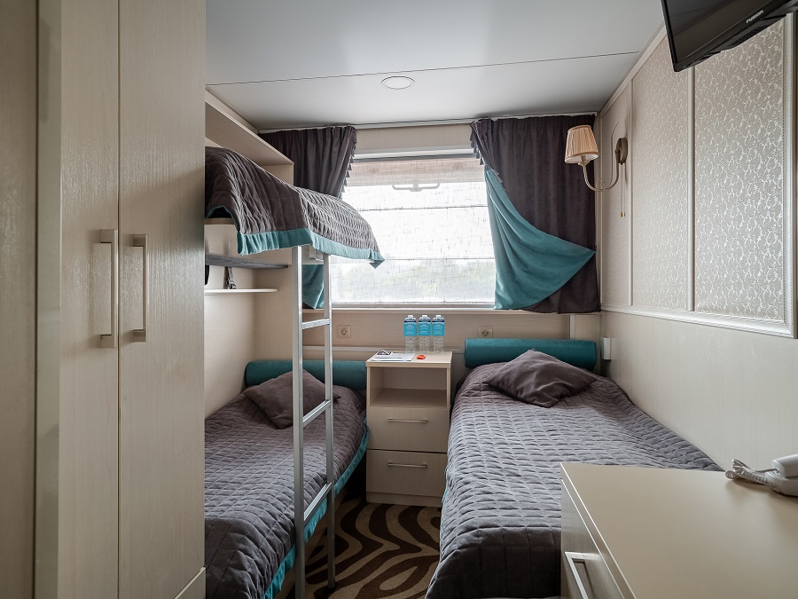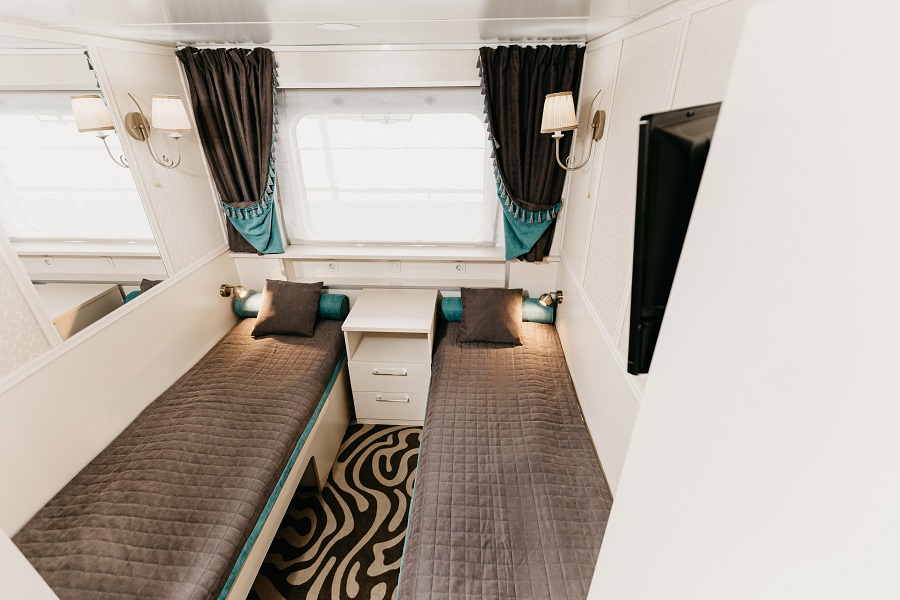 | Средняя палуба | А2-С комфорт К категории А2-С комфорт относятся каюты: 313–318. Двухместная каюта со всеми удобствами, расположенная на средней палубе. Площадь каюты от 9,5 до 10,1 м². Возможно размещение третьего человека на дополнительном спальном месте – верхняя полка с мягким ограждением. Размещение ребенка до 5 лет без места и питания, при наличии свободного дополнительного места, производится только по согласованию с судоходной компанией. В каюте: две односпальные кровати, ванная комната (раковина, душ, туалет), прикроватная тумба, шкаф, туалетный стол, пуф, вешалка для верхней одежды, холодильник, радио, телевизор с кабельным и спутниковым вещанием, телефон, фен, тапочки, набор посуды, щетка для одежды, плед для каждого туриста, розетки 220 V, система кондиционирования воздуха, обзорное окно. | 2-местное размещение | ✔ |
