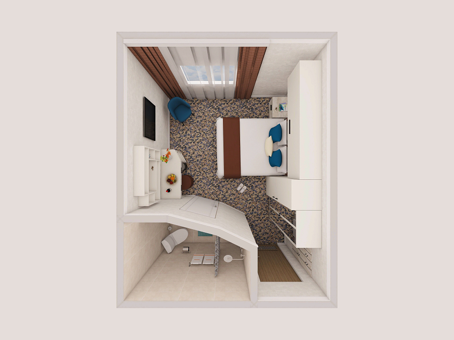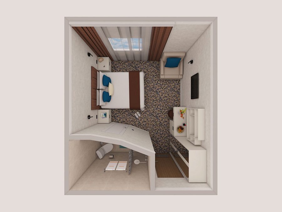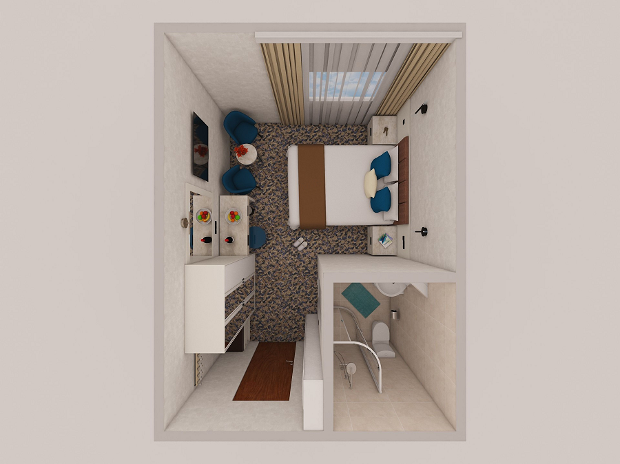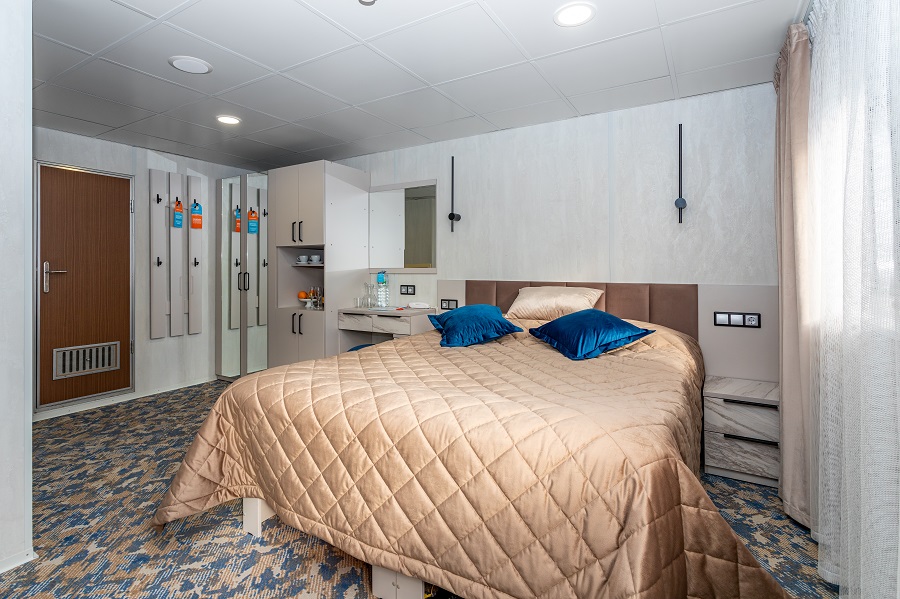 | Главная палуба | Полулюкс Б-С НОВИНКА 2026. Данное изображение каюты является рендером и несет ознакомительный характер.К категории Полулюкс Б-С относятся каюты: 201, 205, 206, 209. Двухместная каюта увеличенной площади со всеми удобствами, расположенная на главной палубе. Площадь каюты ≈ 13,8 м². Возможно размещение третьего человека на дополнительном месте – кресло-кровать. Размер дополнительного места: 190 см длина и 75 см ширина. Размещение ребенка до 5 лет без места и питания, при наличии свободного дополнительного места, производится только по согласованию с судоходной компанией. В каюте: одна двуспальная кровать (при необходимости трансформируется в две односпальные кровати), кресло-кровать, ванная комната (раковина, душевая кабина, туалет), прикроватные тумбы, туалетный стол, настенная полка, пуф, вешалка для верхней одежды, шкаф для одежды, холодильник, кондиционер, радио, фен, плед для каждого туриста, сейф, телевизор с кабельным и спутниковым вещанием, телефон, розетки 220V, обзорное панорамное окно. Также к услугам гостей: косметика для душа, туалетные принадлежности, щетка для одежды, банные халаты, маски для сна, тапочки, набор посуды и столовых приборов, питьевая вода и «приветственный набор» (игристый напиток, фрукты), мини-бар (за дополнительную плату), капсульная кофемашина (одна чашка кофе на человека – в подарок). | 2-местное размещение | нет |