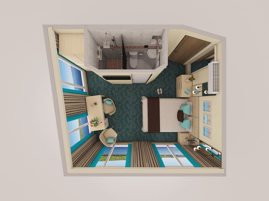 | Средняя палуба | Панорамный полулюкс НОВИНКА 2026. Данное изображение каюты является рендером и несет ознакомительный характер. К категории Панорамный полулюкс относятся каюты: 357, 358. Двухместная каюта с панорамными окнами увеличенной площади со всеми удобствами, расположенная на средней палубе. Площадь каюты ≈ 17 м².В каюте: одна двуспальная кровать (при необходимости трансформируется в две односпальные кровати), ванная комната (раковина, душевая кабина, туалет), прикроватная тумба и комод, стол, два кресла, шкаф для одежды, зеркало, вешалка для верхней одежды, холодильник, кондиционер, сейф, телевизор с кабельным и спутниковым вещанием, радио, фен, розетки 220 V, плед для каждого туриста, обзорные панорамные окна. Также к услугам гостей: косметика для душа, туалетные принадлежности, щетка для одежды, банные халаты, маски для сна, тапочки, набор посуды и столовых приборов, чайная пара, питьевая вода, приветственный набор (игристый напиток, фрукты), капсульная кофемашина (одна чашка кофе на человека – в подарок), мини-бар (за дополнительную плату). | 2-местное размещение | нет |