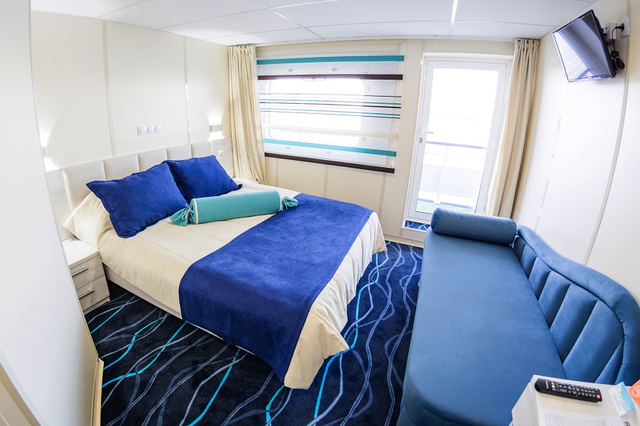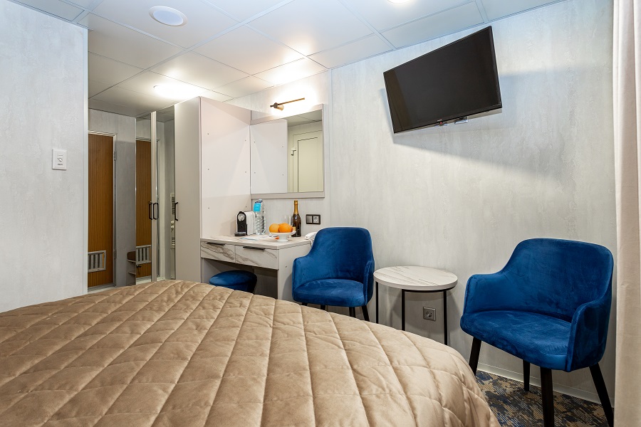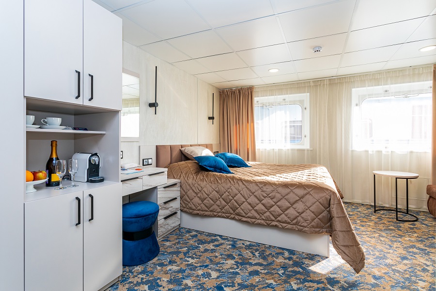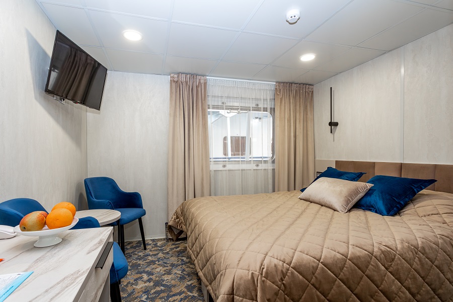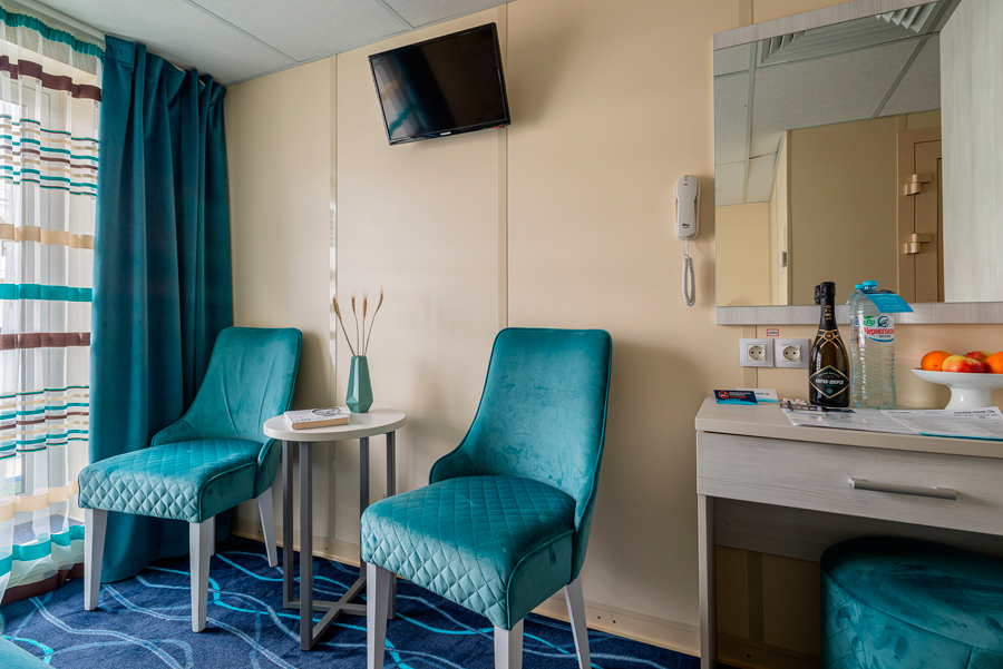 | Средняя палуба | Полулюкс Б К категории Полулюкс Б относятся каюты: 305–308, 349–352.Двухместная каюта увеличенной площади со всеми удобствами, расположенная на средней палубе. Площадь каюты от 13,3 до 15 м².В каюте: одна двуспальная кровать (при необходимости трансформируется в две односпальные кровати), ванная комната (раковина, душевая кабина, туалет), прикроватные тумбы, туалетный стол, пуф, стол журнальный, два кресла, вешалка для верхней одежды, шкаф, холодильник, кондиционер, радио, фен, плед для каждого туриста, сейф, телевизор с кабельным и спутниковым вещанием, телефон, розетки 220 V, обзорное панорамное окна.Также к услугам туристов в каюте: косметика для душа, туалетные принадлежности, щетка для одежды, банные халаты, маски для сна, тапочки, набор посуды и столовых приборов, питьевая вода и «приветственный набор» (игристый напиток, фрукты), мини-бар (за дополнительную плату), капсульная кофемашина (одна чашка кофе на человека – в подарок). | 2-местное размещение | ✔ |