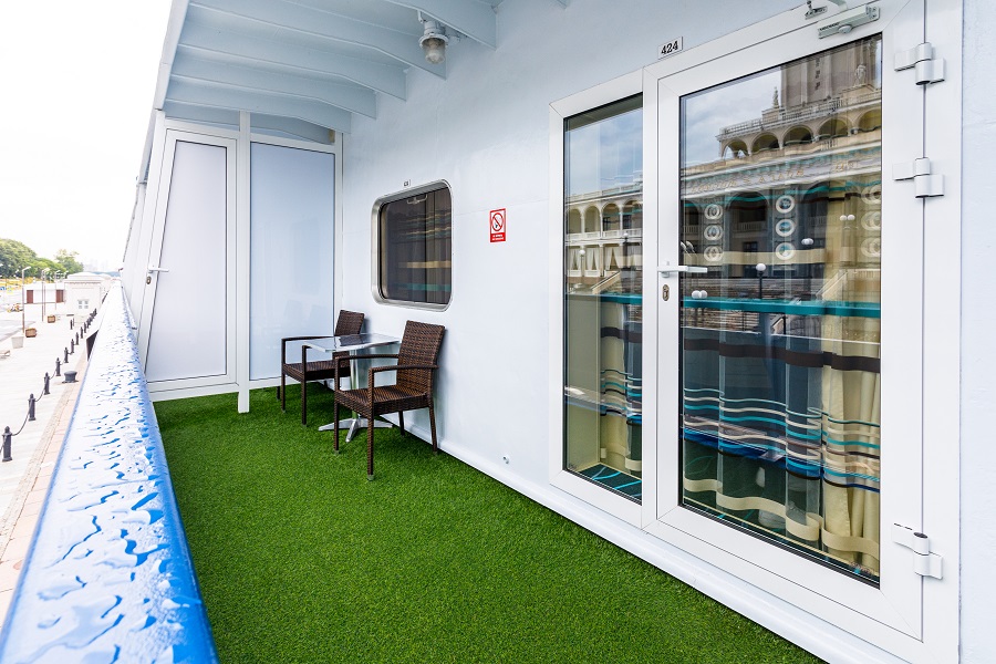 | Шлюпочная палуба | Полулюкс с балконом А К категории Полулюкс с балконом А относятся каюты: 422, 424. Каюты данной категории носят имена: № 422 – «Анна Герман» № 424 – «Владимир Высоцкий» Двухместная каюта увеличенной площади со всеми удобствами, расположенная на шлюпочной палубе. Площадь каюты от 24,3 до 30,9 м² (включая балкон от 7,1 до 8,4 м²). Возможно размещение третьего и четвертого человека на дополнительных местах – двуспальный диван. Размещение ребенка до 5 лет без места и питания, при наличии свободного дополнительного места, производится только по согласованию с судоходной компанией. В каюте: одна двуспальная кровать (при необходимости трансформируется в две односпальные кровати), двуспальный диван (2 дополнительных спальных места), ванная комната (раковина, душевая кабина, туалет), прикроватные тумбы, туалетный стол, пуф, стол журнальный, шкаф, вешалка для верхней одежды, сейф, холодильник, кондиционер, радио, фен, плед для каждого туриста, телевизор с кабельным и спутниковым вещанием, телефон, розетки 220 V, wi-fi роутер, стеклянная балконная дверь, персональный балкон с мебелью для отдыха. Также к услугам туристов в каюте: косметика для душа, туалетные принадлежности, щетка для одежды, банные халаты, маски для сна, тапочки, набор посуды и столовых приборов, чайная пара, питьевая вода и «приветственный набор» (игристый напиток, фрукты), мини-бар (за дополнительную плату), капсульная кофемашина (одна чашка кофе на человека – в подарок). | 2-местное размещение | ✔ |