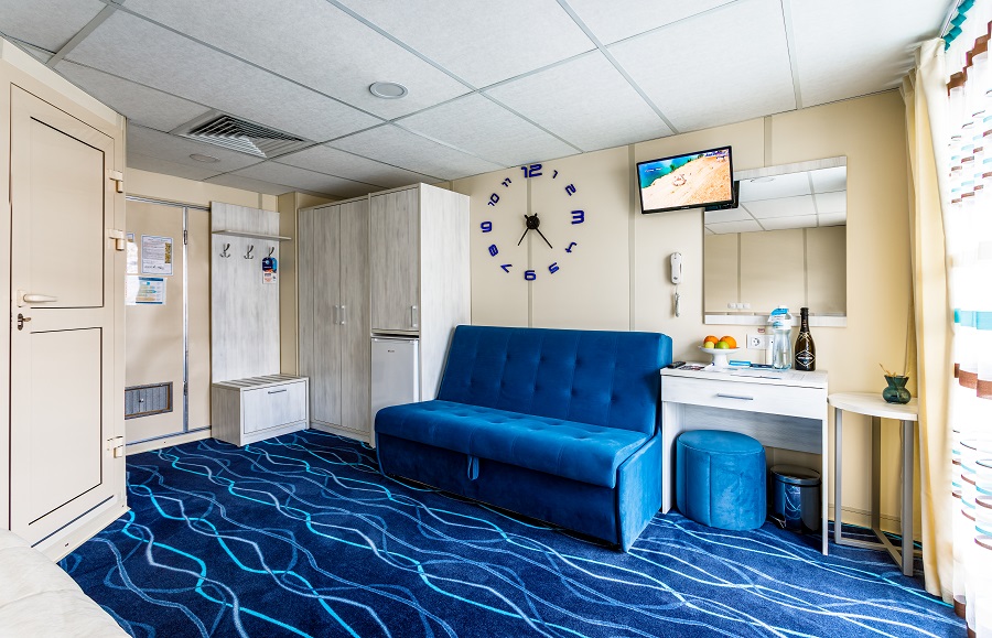 | Средняя палуба | Полулюкс А К категории Полулюкс А относятся каюты: 309, 310, 353–356.Двухместная каюта увеличенной площади со всеми удобствами, расположенная на средней палубе. Площадь каюты от 16,4 до 19,5 м². Возможно размещение третьего и четвертого человека на дополнительных местах – двуспальный диван. Размещение ребенка до 5 лет без места и питания, при наличии свободного дополнительного места, производится только по согласованию с судоходной компанией. В каюте: одна двуспальная кровать (при необходимости трансформируется в две односпальные кровати), двуспальный диван, шкаф, прикроватные тумбы, туалетный стол, зеркало, пуф, кресло, журнальный стол, вешалка для верхней одежды, холодильник, ванная комната (раковина, душевая кабина, туалет), кондиционер, радио, плед для каждого туриста, сейф, фен, телевизор с кабельным и спутниковым вещанием, щетка для одежды, розетки 220 V, обзорное окно. Также к услугам туристов в каюте: косметика для душа, банные халаты, маски для сна, тапочки, набор посуды и столовых приборов, питьевая вода и «приветственный набор» (игристый напиток, фрукты), мини-бар (за дополнительную плату), капсульная кофемашина (одна чашка кофе на человека – в подарок). | 2-местное размещение | ✔ |