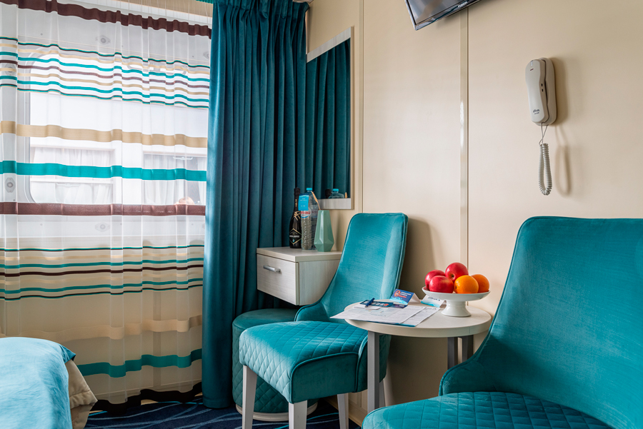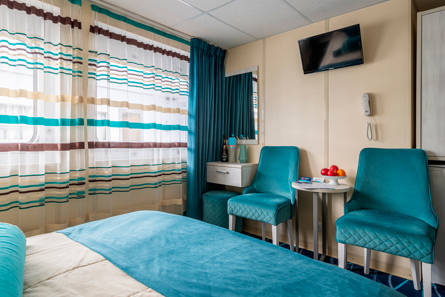 | Средняя палуба | А2 комфорт (средняя палуба) К категории А2 комфорт (средняя палуба) относятся каюты: 319–348. Двухместная каюта со всеми удобствами, расположенная на средней палубе. Площадь каюты от 9,5 до 10,1 м². В каюте: две односпальные кровати, ванная комната (раковина, душ, туалет), прикроватная тумба, шкаф, туалетный стол, пуф, вешалка для верхней одежды, холодильник, радио, телевизор с кабельным и спутниковым вещанием, телефон, фен, тапочки, набор посуды, щетка для одежды, плед для каждого туриста, розетки 220 V, система кондиционирования воздуха, обзорное окно. | 2-местное размещение | ✔ |