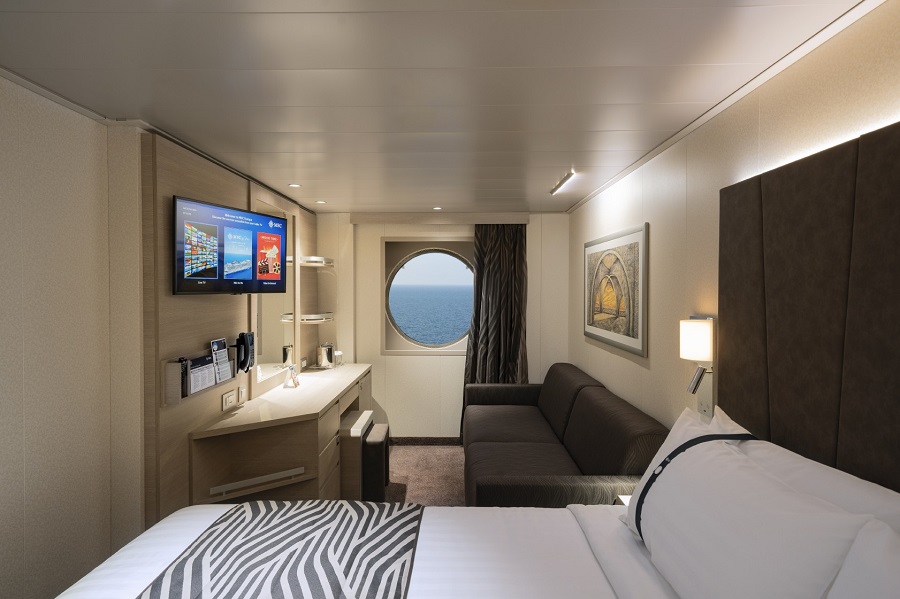| Guaranty | С окном DBL С окном DBL – двухместная каюта (гарантированная), номер каюты будет известен только перед началом круиза.Максимальная вместимость: 4 человека. Дополнительные спальные места – двухъярусная кровать или диван, трансформирующийся в двухъярусную кровать, и/или раскладной диван. Обзорное окно не открывается. В каюте: две односпальные кровати (при необходимости трансформируются в двуспальную кровать), ванная комната (раковина, душ, туалет), телефон, фен, мини-бар, сейф, кондиционер, интерактивное TV, беспроводной интернет (оплачивается дополнительно), обзорное окно (не открывается). | 2-местное размещение | ✔ |