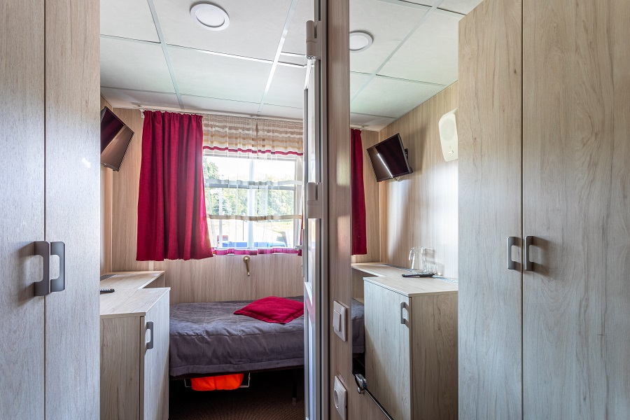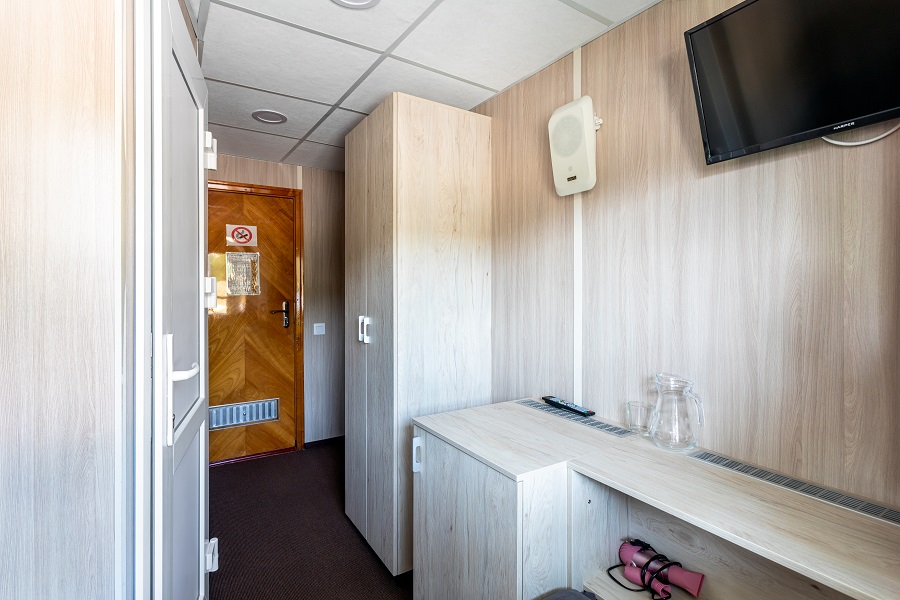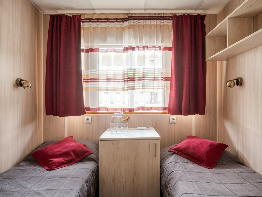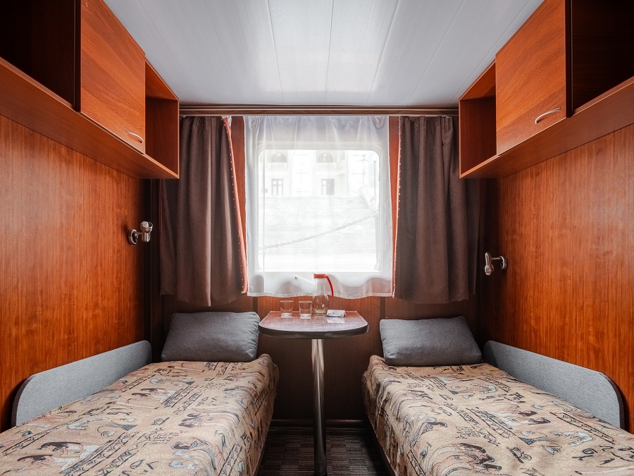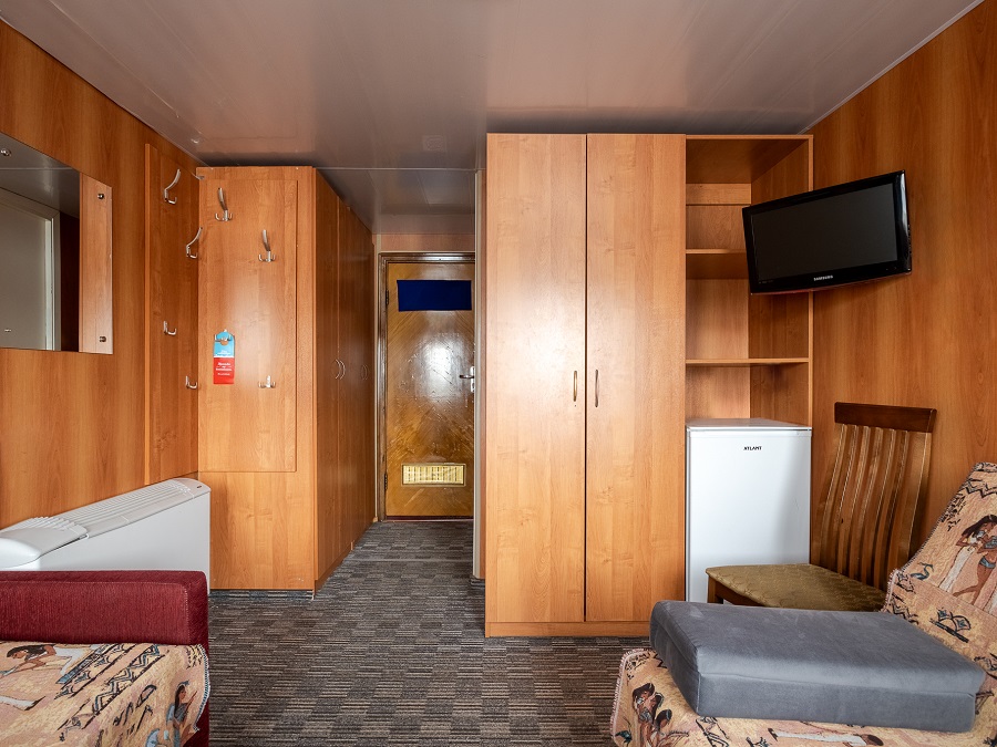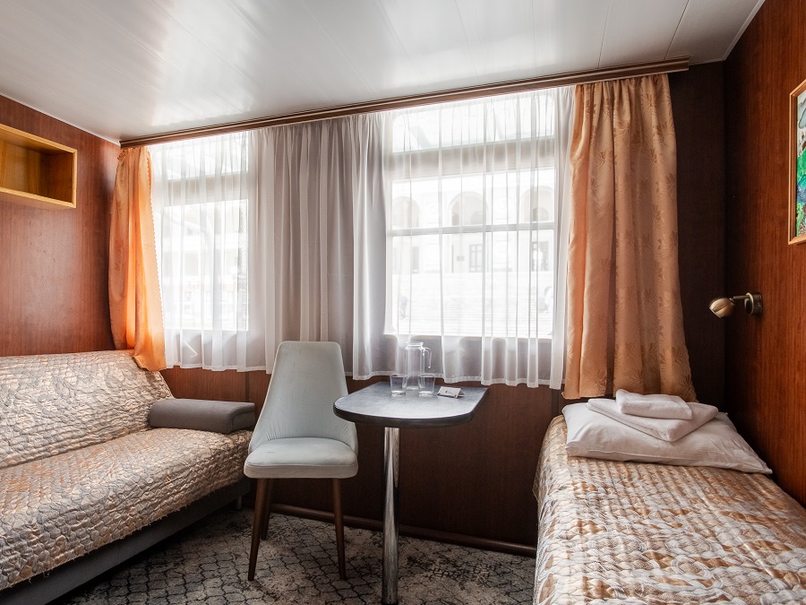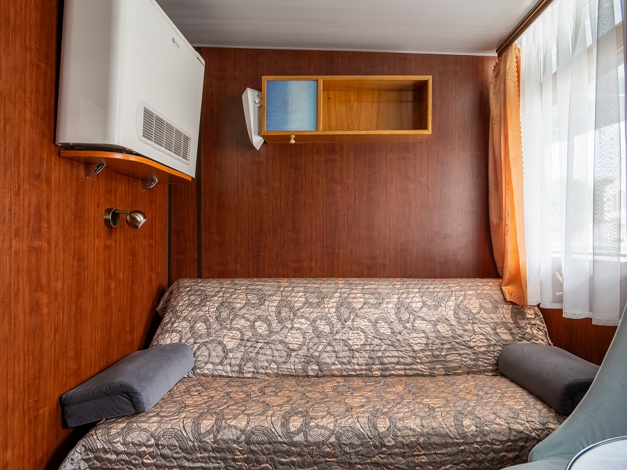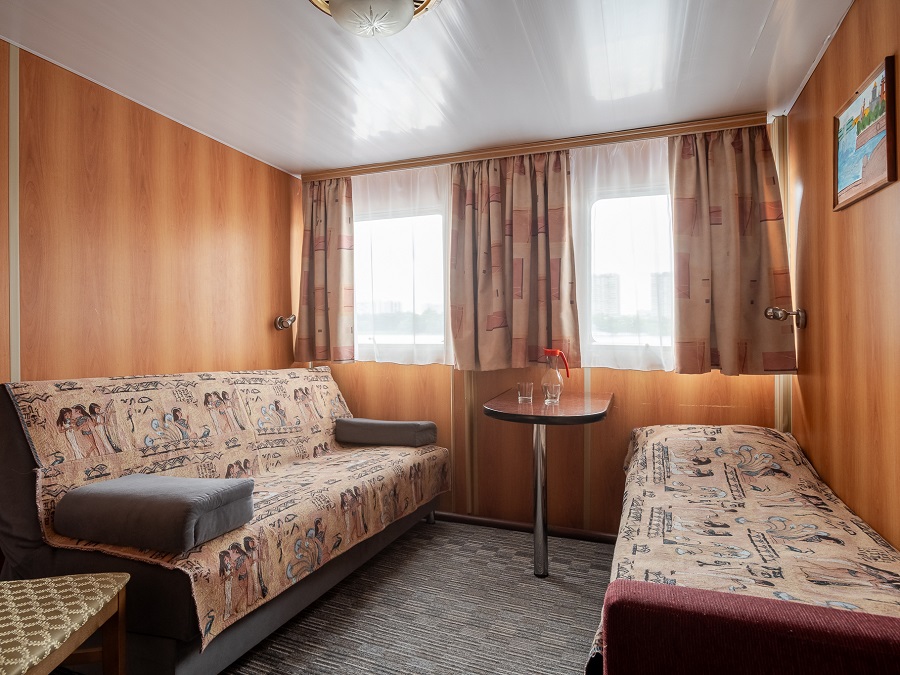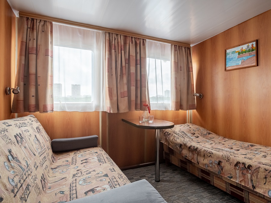 | Средняя палуба | А2 К категории А2 относятся каюты: 102–109, 112, 113, 116, 117, 202–209, 225, 229, 231, 233–242. Двухместная каюта со всеми удобствами, расположенная на главной и средней палубах. В каюте: два односпальных дивана, ванная комната (раковина, душ, туалет), шкаф для одежды, стол, холодильник, фен, телевизор, обзорное окно. | 2-местное размещение | ✔ |
