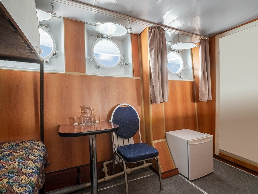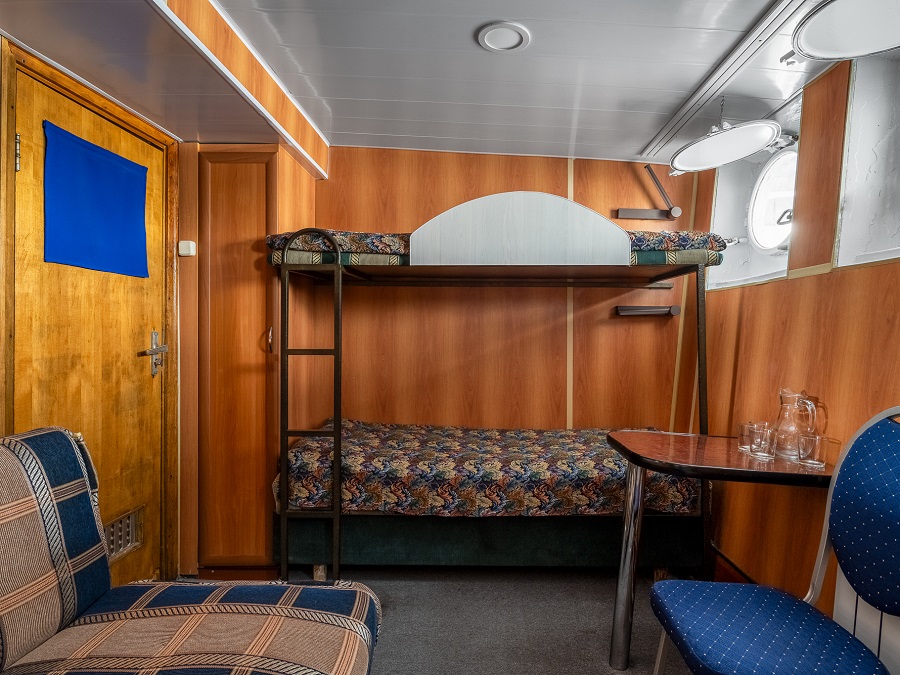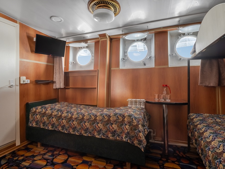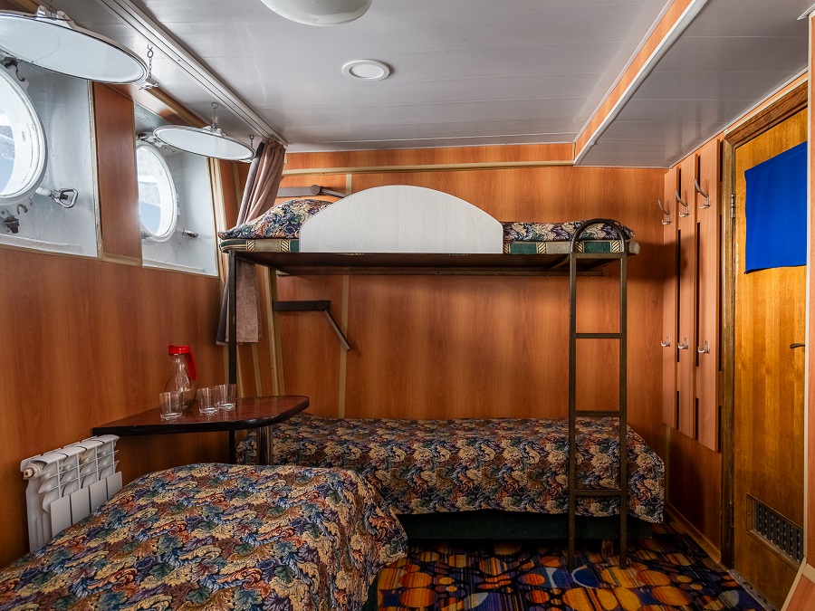 | Нижняя палуба | А4Н К категории А4Н относятся каюты: 008–012. Двухместная каюта со всеми удобствами, расположенная на нижней палубе. Возможно размещение третьего и четвертого человека на дополнительном месте – диван и полка верхнего расположения. В каюте: двуспальный диван, односпальный диван нижнего расположения, полка верхнего расположения, ванная комната (раковина, душ, туалет), шкаф для одежды, стол, холодильник, фен, телевизор, общая система вентиляции, иллюминаторы. | 2-местное размещение | нет |