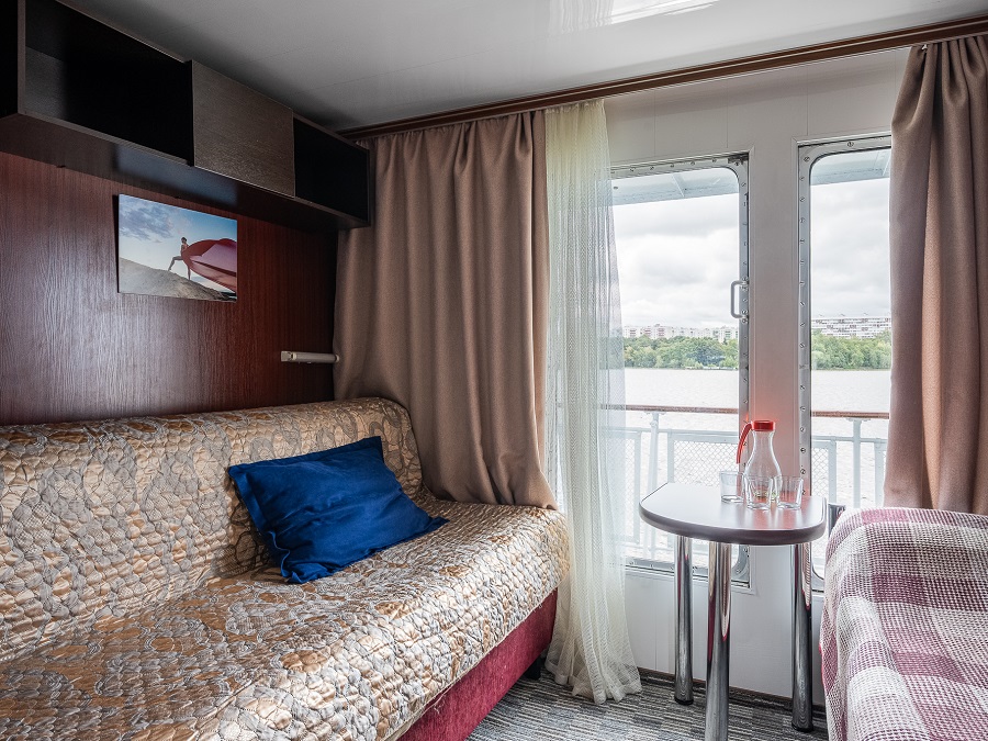 | Шлюпочная палуба | А2+(I) К категории А2+(I) относятся каюты: 307, 310–317. Двухместная каюта увеличенной площади со всеми удобствами, расположенная на шлюпочной палубе. Возможно размещение третьего человека на дополнительном месте – диван. В каюте: двуспальный диван, односпальный диван, ванная комната (раковина, душ, туалет), шкаф для одежды, стол, холодильник, фен, телевизор, общая система вентиляции, обзорные окна. | 2-местное размещение | ✔ |