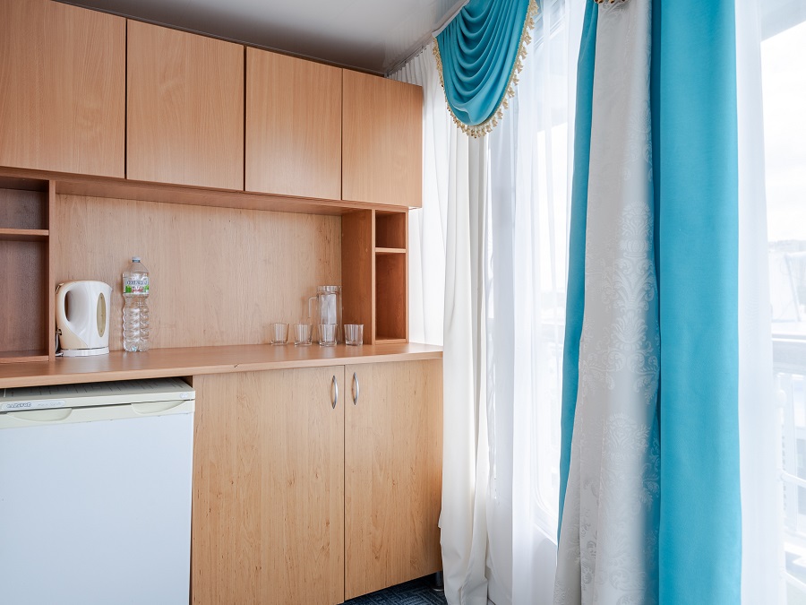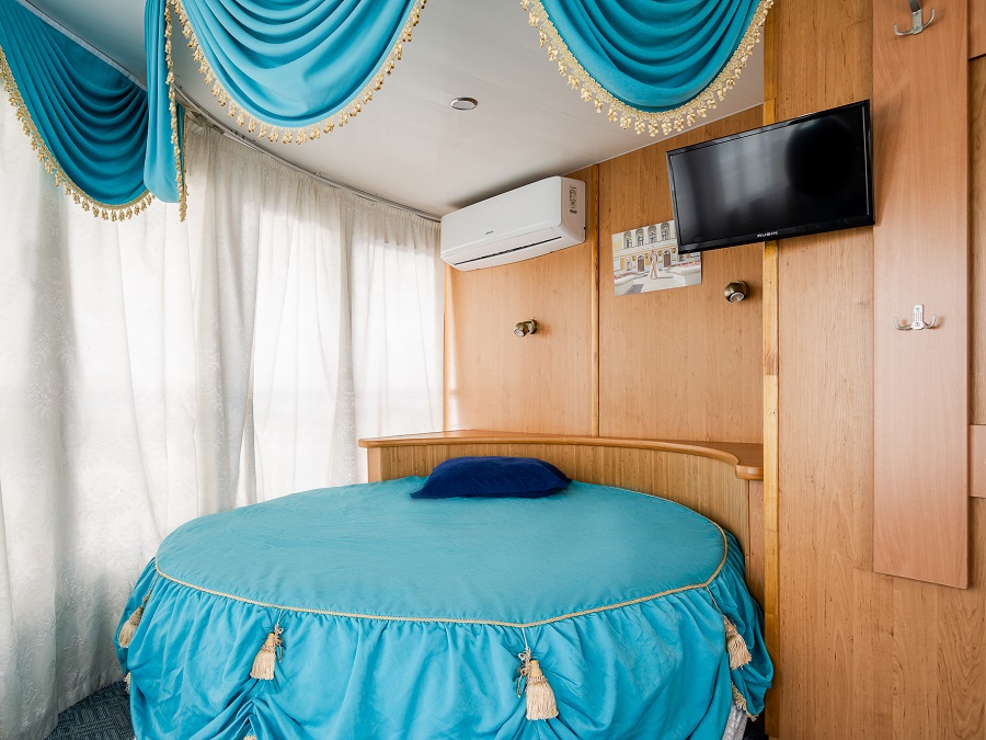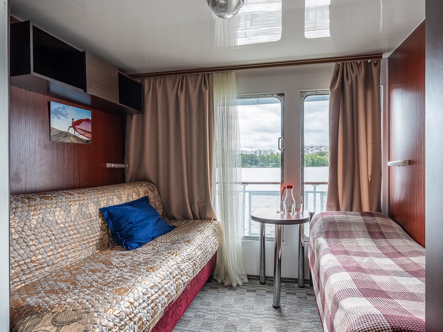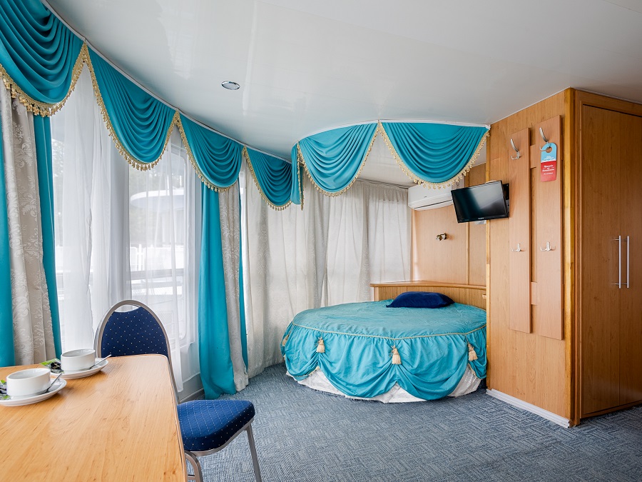 | Шлюпочная палуба | Полулюкс К категории Полулюкс относятся каюты: 223, 301–306, 309. Каюта увеличенной площади со всеми удобствами, расположенная на средней и шлюпочной палубах. В каюте 305 – двуспальный диван и односпальная кровать, кондиционер. В каюте 309 – одно дополнительное место. Возможно размещение третьего и четвертого человека на дополнительном месте – двуспальный диван. В каюте: двуспальная кровать, двуспальный диван, ванная комната (раковина, душ, туалет), шкаф для одежды, стол, холодильник, фен, телевизор, внутренний телефон, общая система вентиляции, обзорные окна. Также к услугам туристов в каюте: банные халаты, тапочки, набор посуды и столовых приборов, питьевая вода. | 2-местное размещение | ✔ |