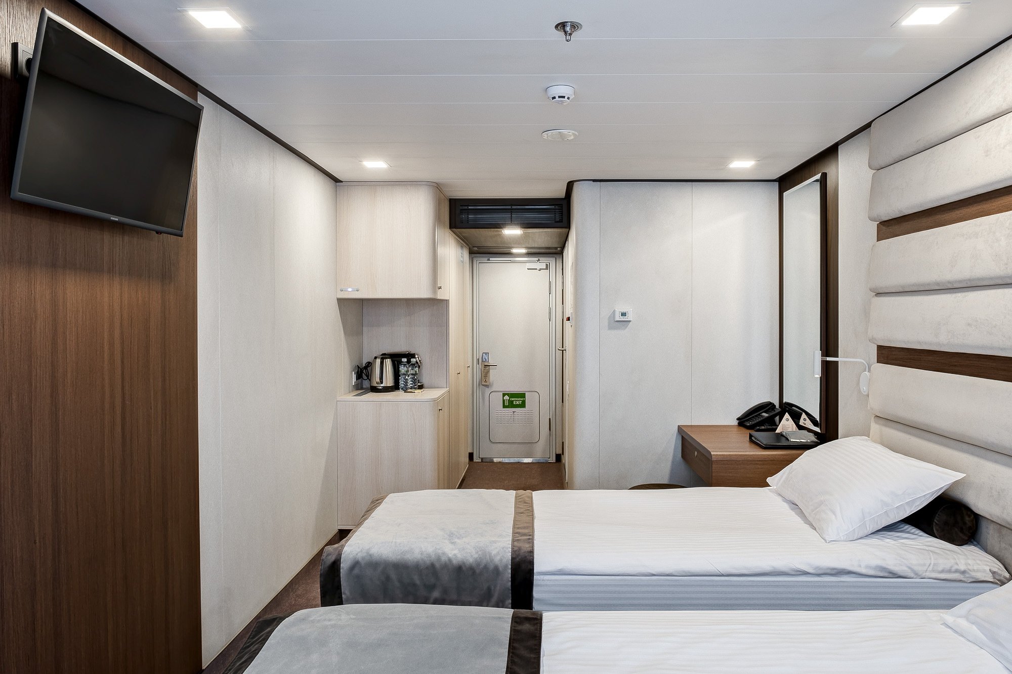| Средняя палуба | Двухместная Комфортабельная одноярусная каюта, рассчитанная на двух человек В каюте: две односпальные кровати (сдвигаются), панорамное окно, спутниковое ТВ, шкаф для одежды, холодильник, кондиционер, розетки 220V, телефон, радио, фен, сейф, капсульная кофемашина, электрочайник, душ, санузел. Площадь — 19 кв.м. | 1-местное размещение | нет |
