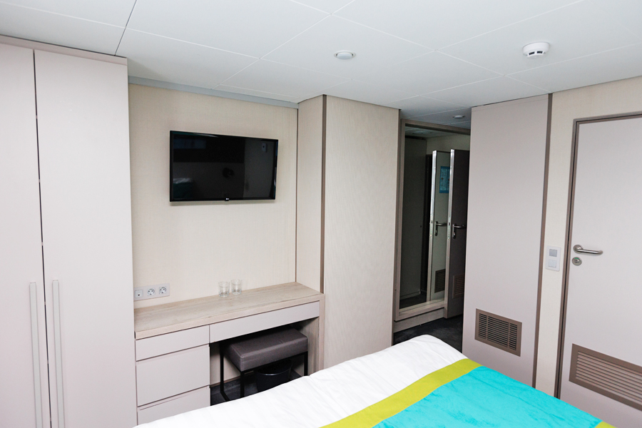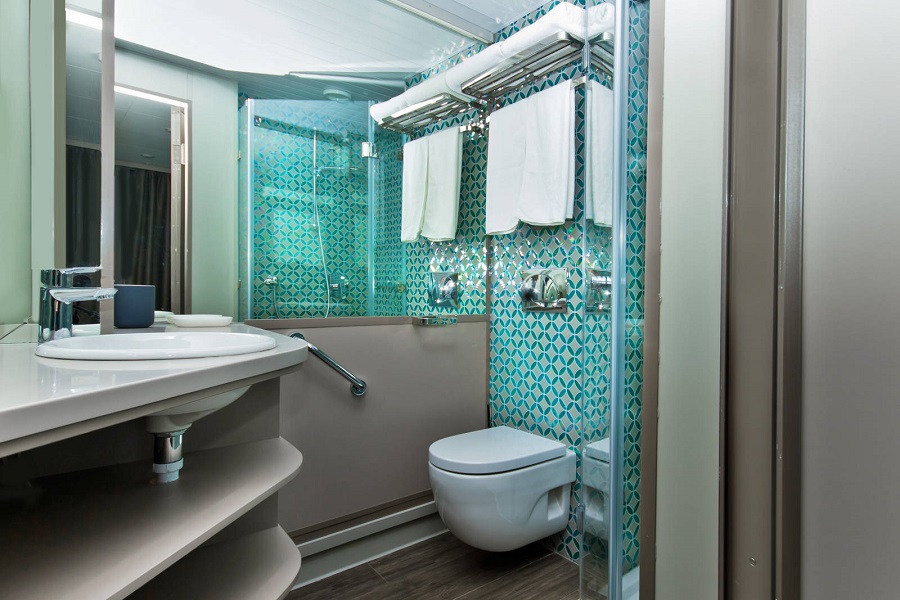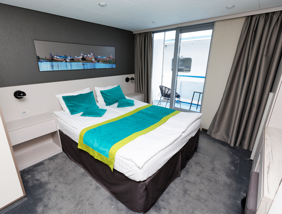 | Средняя палуба | Комфорт премиум (средняя палуба) К категории Комфорт премиум (средняя палуба) относятся каюты: 301–304.Двухместная каюта со всеми удобствами, расположенная на средней палубе. Площадь каюты ≈ 13 м². Размер кровати – 160х200 см. Доступ к Wi-Fi предоставляется с ограничением трафика. Каюты с панорамным остеклением и выходом на палубу. В каюте: двуспальная кровать (можно раздвинуть), кондиционер/обогреватель, телевизор, сейф, внутренний телефон, фен, холодильник, стеклянные стаканы для питья, щетка для одежды, тапочки, панорамное окно. В ванной комнате: душ, зеркало, 2 стакана, туалетные принадлежности (мыло, шампунь, гель для душа в тюбиках, туалетная бумага), комплект полотенец (полотенце банное большое, полотенце для рук среднее). | 2-местное размещение | нет |