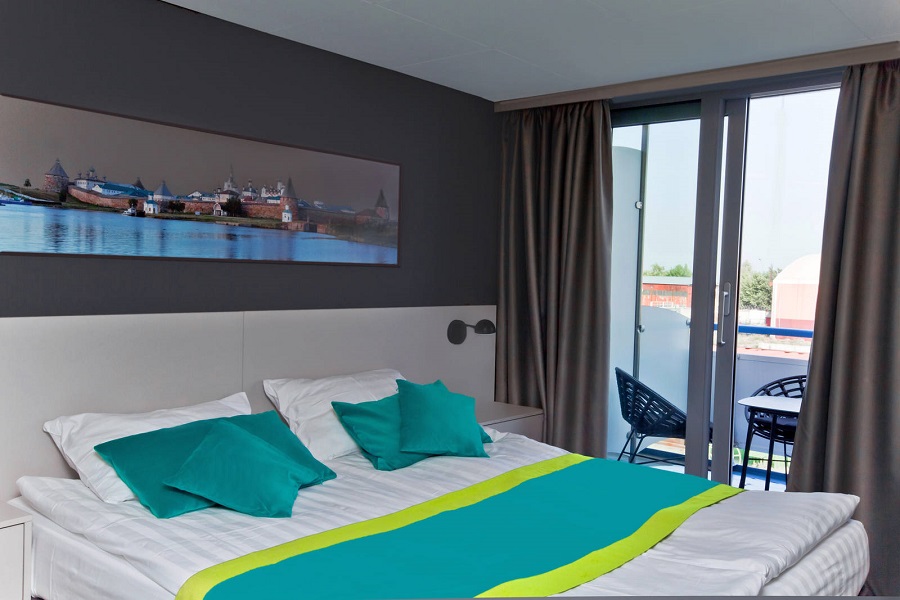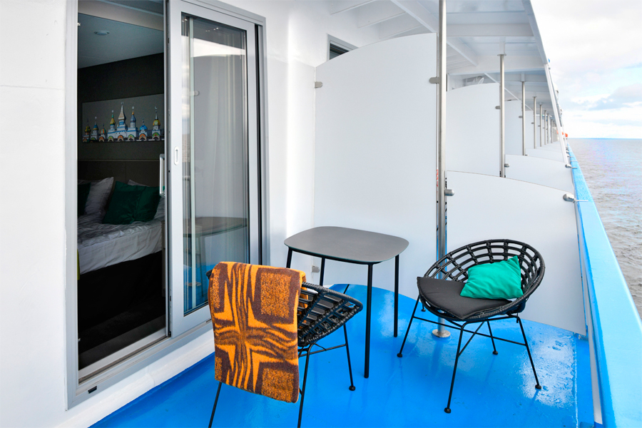 | Шлюпочная палуба | Полулюкс с балконом (шлюпочная палуба) К категории Полулюкс с балконом (шлюпочная палуба) относятся каюты: 401, 402, 405–410, 417–420, 423–428, 430, 434.Двухместная каюта с балконом и со всеми удобствами, расположенная на шлюпочной палубе. Площадь каюты ≈ 15 м². Площадь балкона ≈ 6 м². Размер кровати – 160х200 см. Доступ к Wi-Fi предоставляется с ограничением трафика. В каюте 424 – двуспальная кровать не раздвигается. В каюте: двуспальная кровать (можно раздвинуть), кондиционер/обогреватель, телевизор, сейф, внутренний телефон, фен, холодильник, стаканы для питья, щетка для одежды, тапочки, панорамное остекление и выход на балкон. В ванной комнате: душ, зеркало, 2 стакана, туалетные принадлежности (мыло, шампунь, гель для душа в тюбиках, туалетная бумага), комплект полотенец (полотенце банное большое, полотенце для рук среднее). | 2-местное размещение | ✔ |